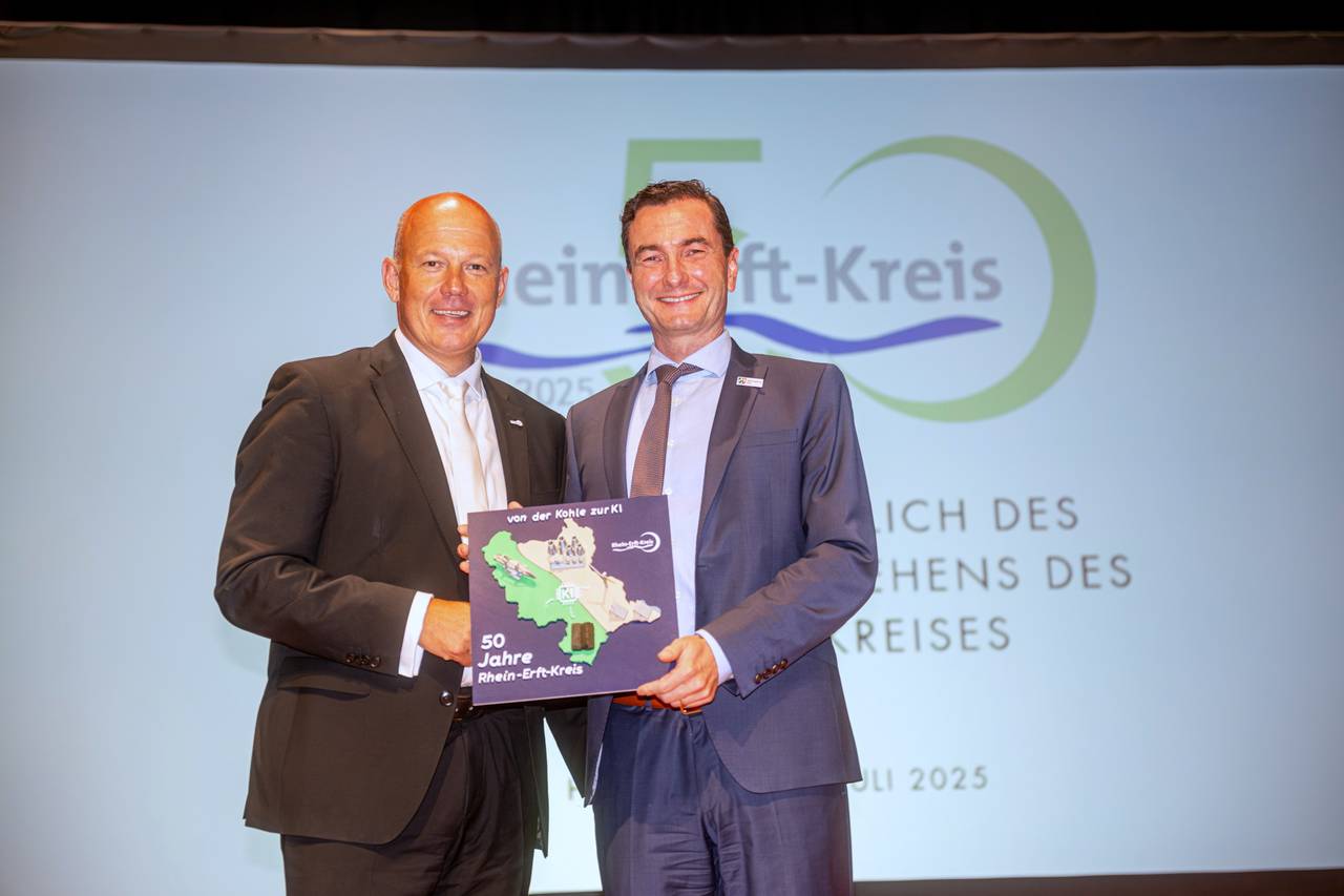 Regierungspräsident Dr. Thomas Wilk hielt die Festrede und lobte die Entwicklung des Kreises zu einem wirtschaftlich starken und lebensfreundlichen Standort. Die Gründung des Kreises war nach seinen Angaben eine gute Idee und die 50 Jahre sind ein Meilenstein. Hürths Bürgermeister Dirk Breuer gratulierte stellvertretend für die Bürgermeisterinnen und Bürgermeister des Kreises und hob die enge Zusammenarbeit zwischen Kreis und Kommunen hervor.