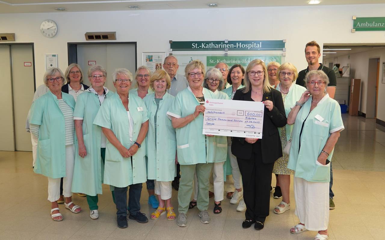 Die Grünen Damen und Herren des St. Katharinen-Hospitals in Frechen haben eine Spende von 600 Euro erhalten. Bürgermeisterin Susanne Stupp überreichte das Geld, das aus einer Adventskalenderaktion des Rathauses stammt.