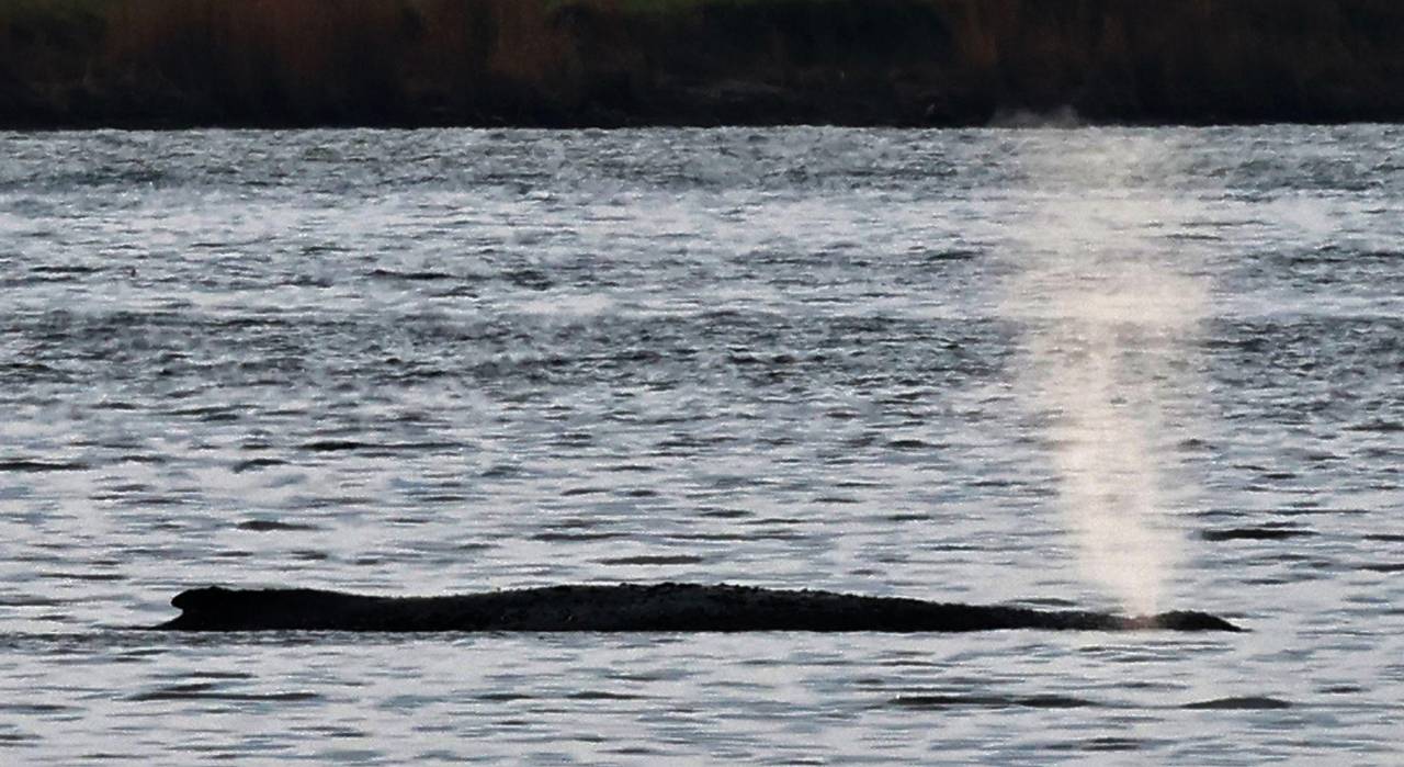 Am Vormittag lag der Buckelwal wieder eher ruhig in der Bucht. In regelmäßigen Abstanden war seine Atmung anhand der Wasserfontänen zu beobachten. Am Vortag hatte das Tier zeitweise stark mit der Schwanz- und den Brustflossen geschlagen und sich leicht hin und her gedreht.