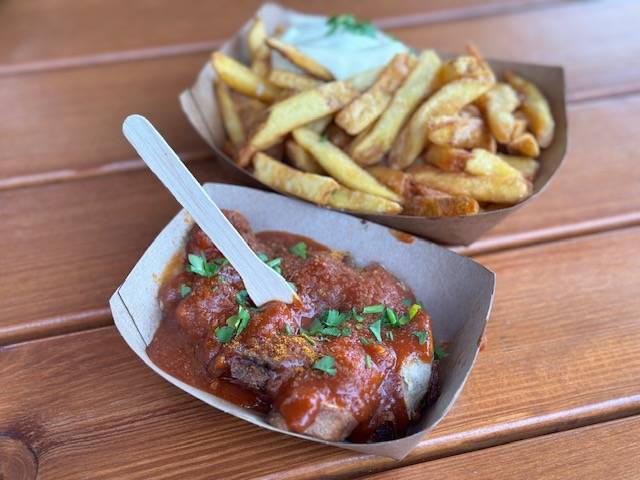 Beim Lesen werden meine Augen immer größer. Wenn auf der Karte Dinge stehen wie „Schaschlik von unserem Metzger“, „ohne Palmöl“ oder „frisches Wild“, dann ist sicher, dass die Betreiber sehr sorgfältig ihre Produkte auswählen und auf Qualität achten. Ich probiere Currywurst, der Klassiker und Bruschetta, die vegetarisch ist und eher fancy. Die Currywurst bzw. die Sauce ist sensationell. Der Tomatengeschmack, die fruchtige Note kommt so klar und direkt rüber. Das hat mich sehr begeistert. Die Sauce aus frischen Tomaten wird lange eingekocht und dabei verzichtet man ganz auf den Zusatz von Zucker. Es gibt sie in drei Varianten auch zu kaufen, direkt am Imbiss oder in den umliegenden Supermärkten. Auch die Bruschetta war toll. Frische Zwiebeln, guter Parmesan und Tomaten mit Geschmack und schon schmeckt das Gericht. Solche Gerichte leben von den Produkten, die Eigengeschmack haben müssen.