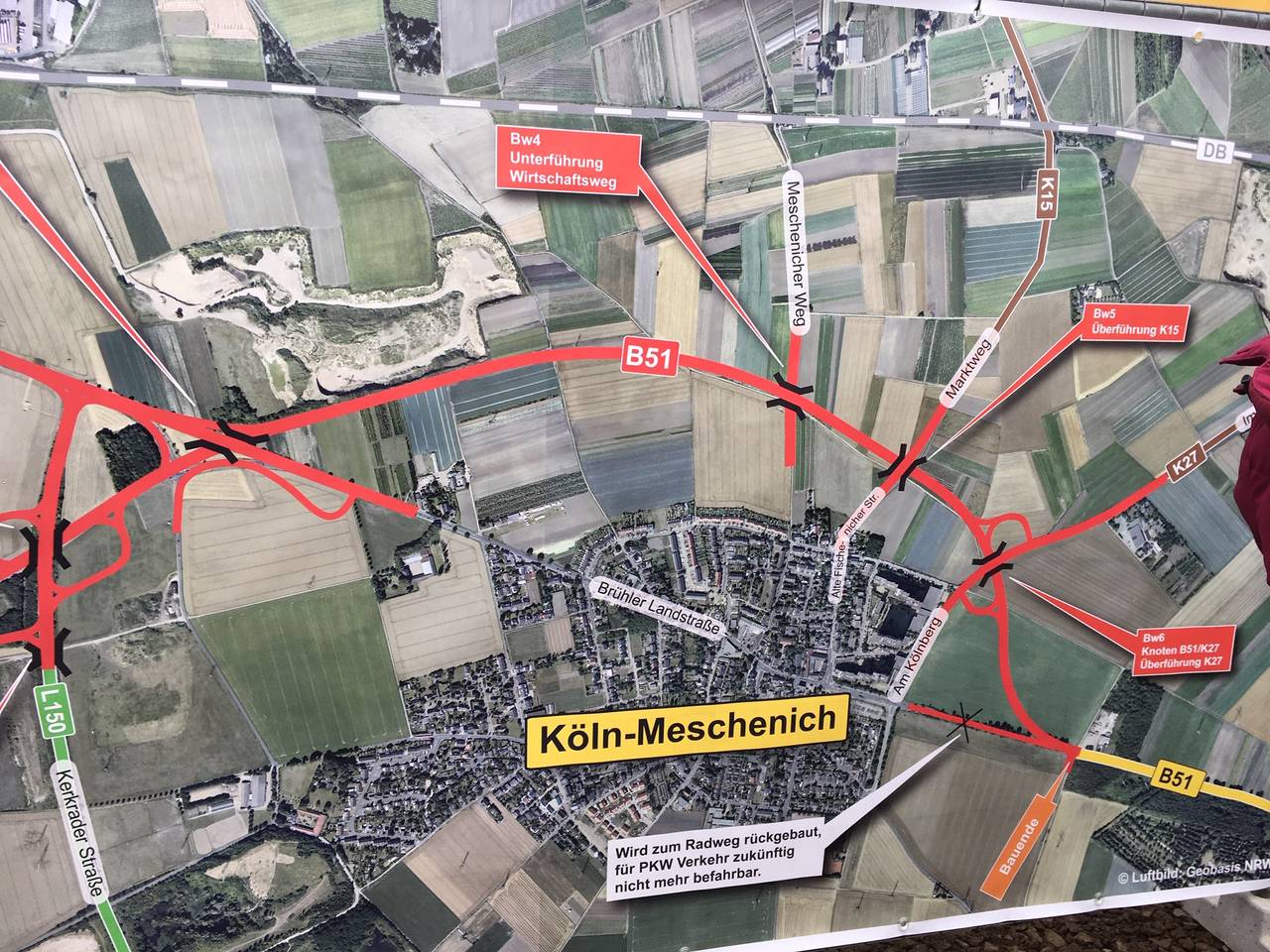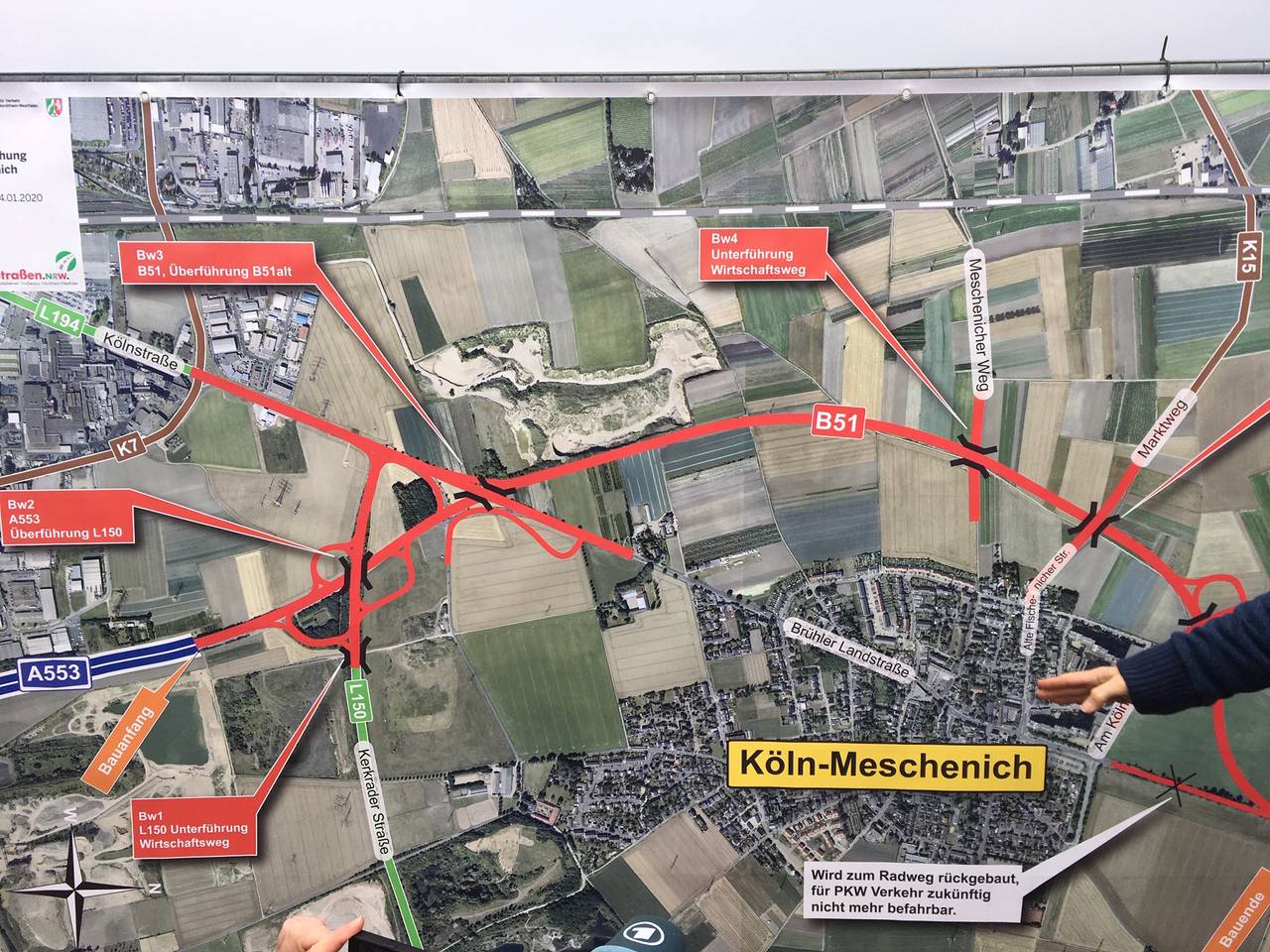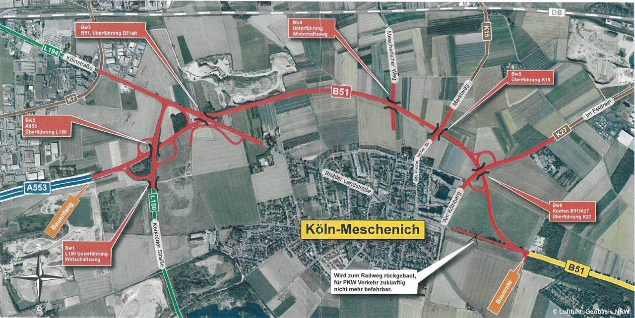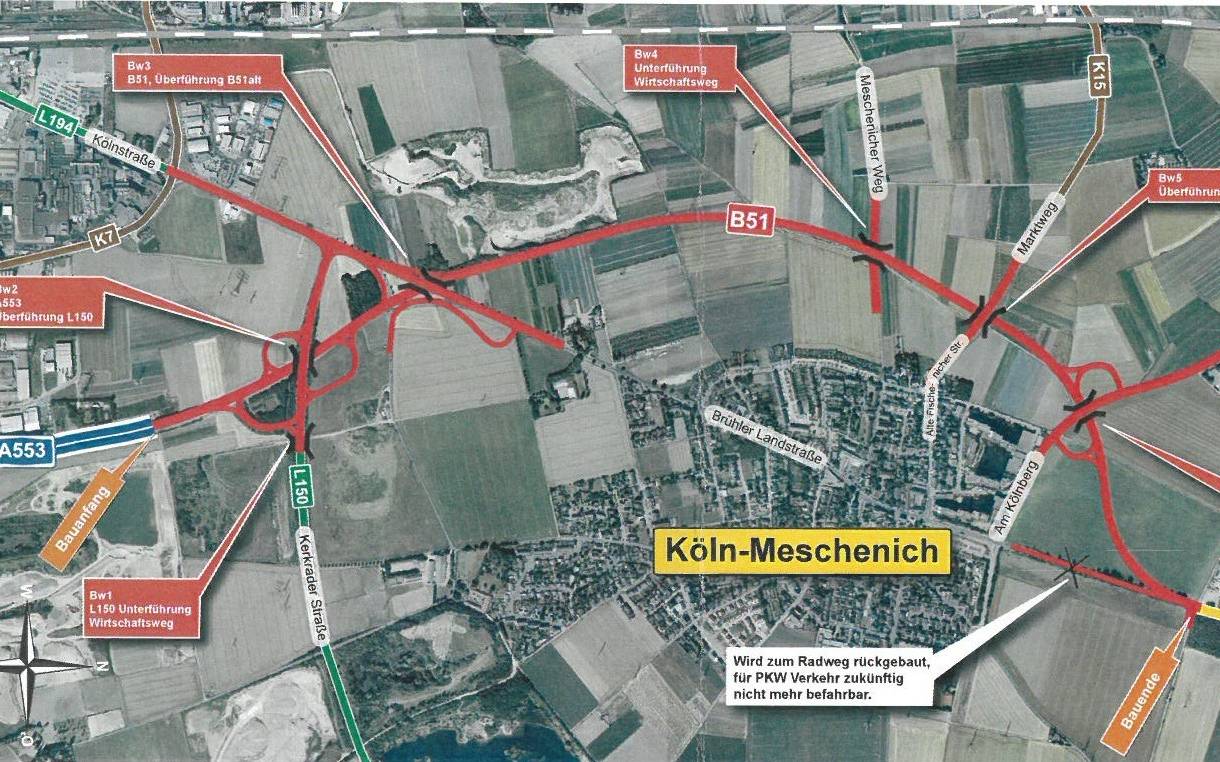 Die neue Straße soll vom Ende der A553 westlich um den Ort herumführen und dann hinter Meschenich wieder auf die B51 treffen. Über einen Knotenpunkt am Kölnberg können die Pendler auch in Richtung Eifeltor und A4 abbiegen. Für NRW-Verkehrsminister Hendrik Wüst ist der Bau der Ortsumgehung dringend nötig, um den Ort um 15.000 Fahrzeuge pro Tag entlasten und gleichzeitig die nötige Infrastruktur für steigende Pendlerzahlen zu schaffen. Bisher mussten Pendler auf der B51 durch Meschenich mit Tempo 30 fahren. Das soll sich Ende 2023 ändern, dann soll die Ortsumgehung fertig sein. Die Kosten für das Projekt liegen bei rund 40 Millionen Euro.