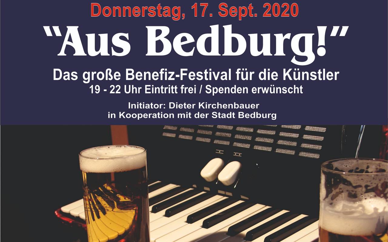 Am 17. September gibt es abends in zahlreichen Outdoor-Locations im Stadtgebiet Musik. Der Eintritt ist frei, es wird um Spenden gebeten. Das Geld geht dann an Bedburger Berufsmusiker, die in diesem Jahr bislang nicht auftreten konnten und denen damit die Existenzgrundlage wegfällt.