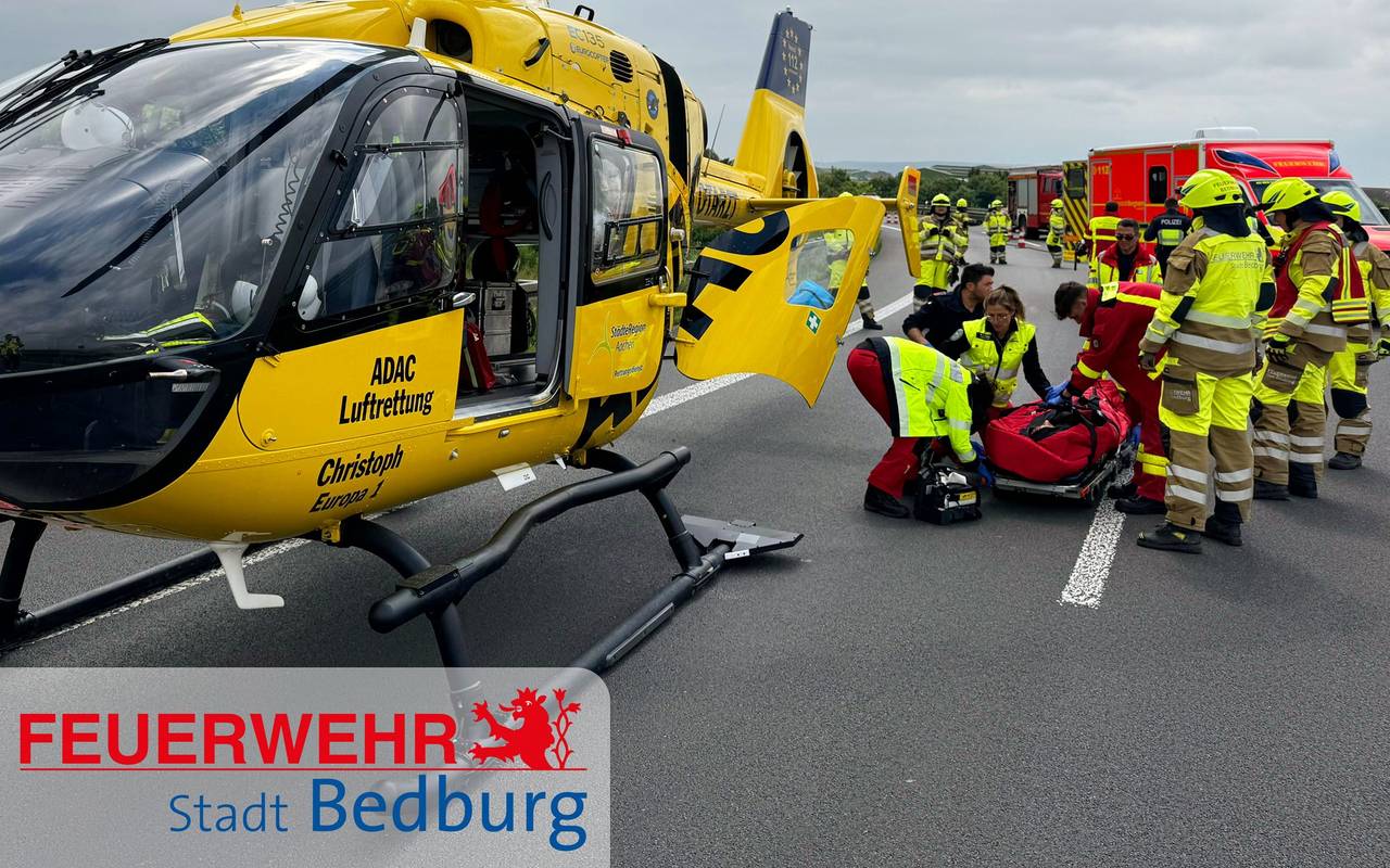 Dort hatte im Dreieck Jackerath ein Motorradfahrer von alleine die Kontrolle über seine Maschine verloren und war so schwer gestürzt, dass ihn ein Rettungshubschrauber in eine Uniklinik bringen musste. Für die Landung und für die Unfallaufnahme der Polizei war die Autobahn kurzzeitig gesperrt. Erst nach dreieinhalb Stunden konnten alle Einsatzkräfte abrücken.