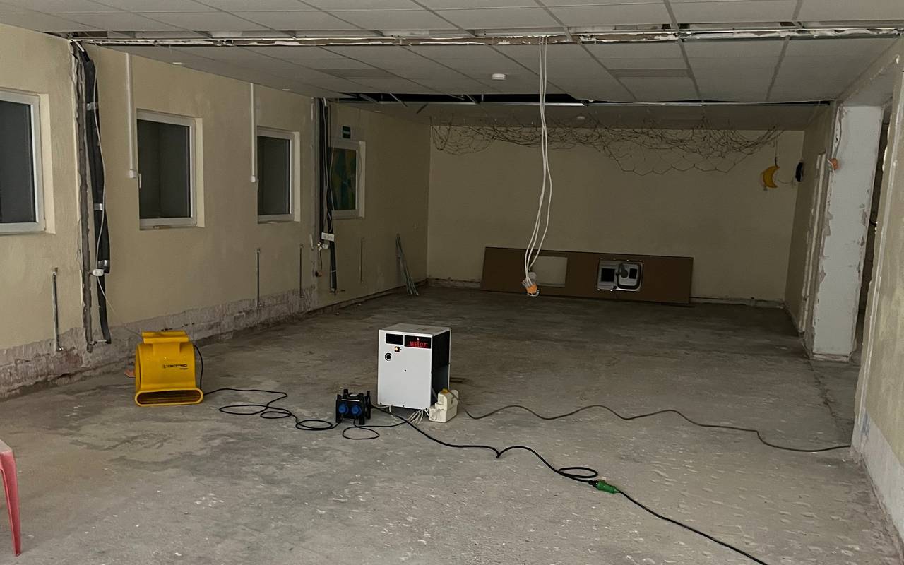Rausgeschlagener Estrich und etliche Bautrockner in den Räumen verteilt – so sieht es aktuell bei der Großtagespflege Sinneswelten in Bedburg aus. Durch den Starkregen Mitte Juni hat es hier einen großen Wasserschaden gegeben, wodurch die gesamte untere Etage nicht mehr nutzbar ist.