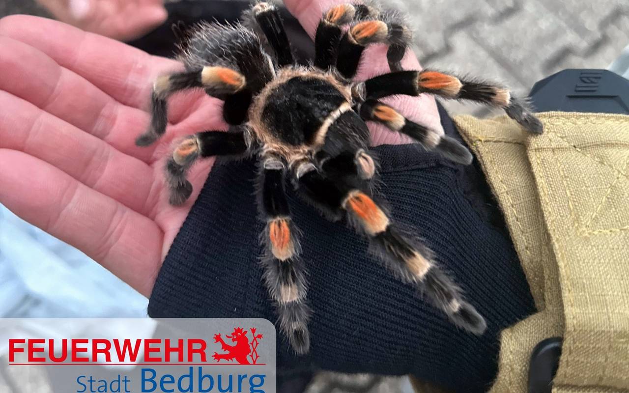 In Kaster krabbelte an einer Hauswand in etwa zehn Metern Höhe eine sogenannte Rotknie-Vogelspinne. Das Tier wurde mit einem Kescher eingefangen und für die weitere Versorgung an einen Experten übergeben.