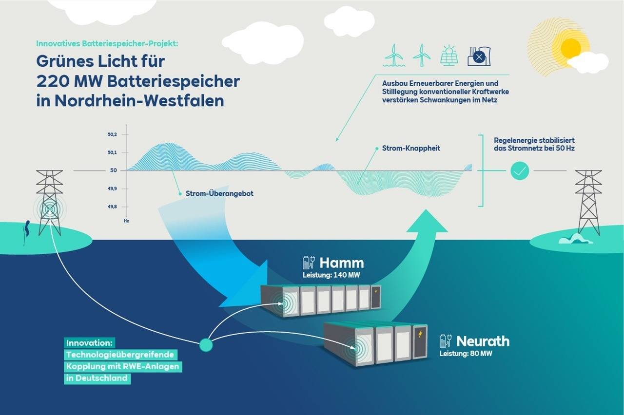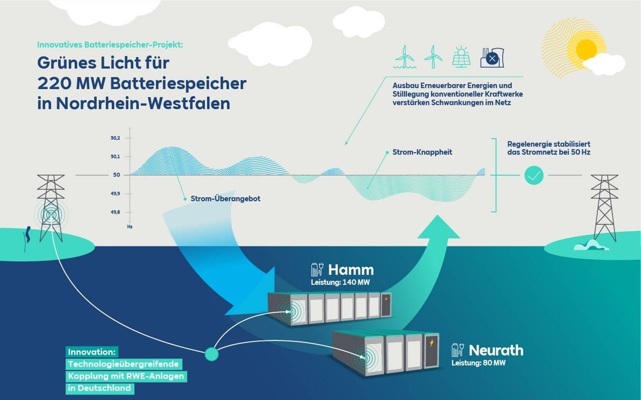 Mit den Batteriespeichern will RWE Schwankungen im Energienetz ausgleichen: Wird zu viel Strom produziert, sollen sie den Energieüberschuss speichern. Gibt es zu wenig Strom im Netz, können die Speicher zusätzlichen Strom einspeisen. Batteriespeicher gelten damit als wichtiger Teil der Energiewende. Ein weiterer Speicher soll am Kraftwerk Westfalen in Hamm entstehen, dieser soll doppelt so groß wie in Neurath werden. Baustart ist laut RWE im nächsten Jahr, 2024 sollen die Speicher voraussichtlich in Betrieb gehen.