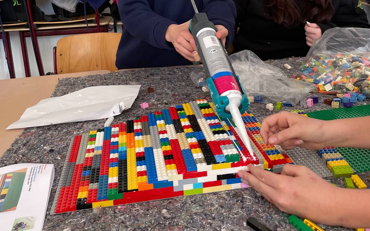 Die erste Lego-Rampe soll an der Treppe zur Sporthalle aufgestellt werden. Nach Angaben von Lehrerin Denise Bille fehlen der Klasse allerdings inzwischen weitere Lego-Steine.