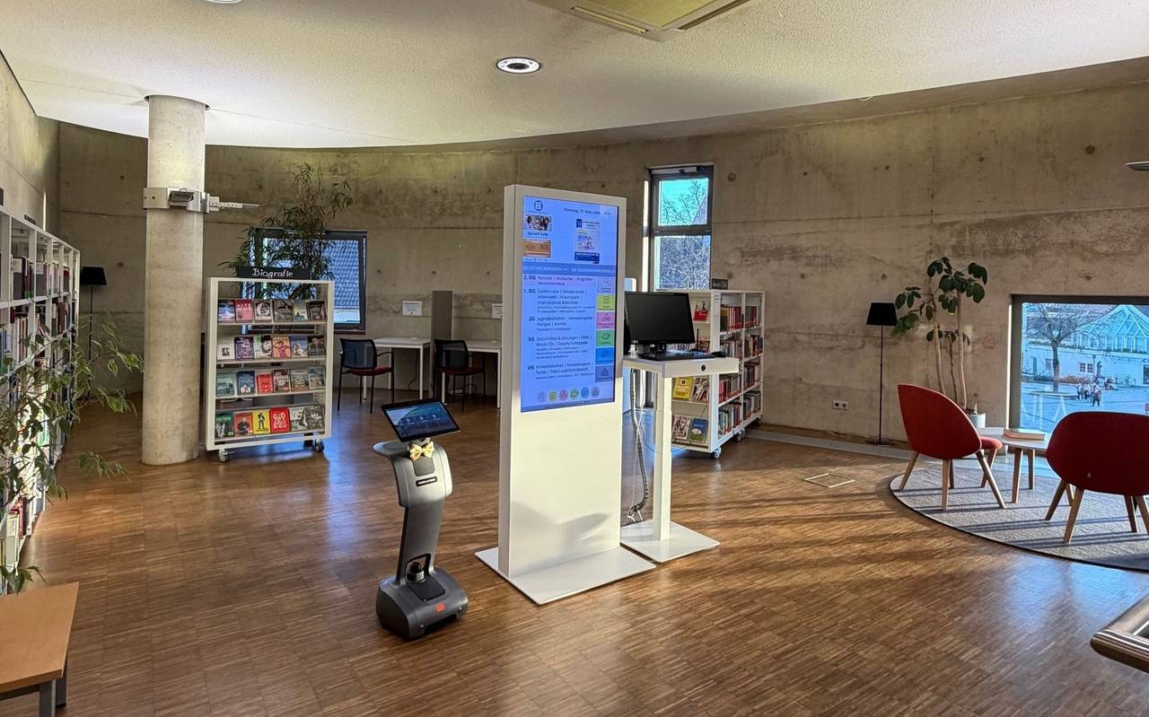 Bei der Suche nach Medien unterstützen in Bergheim inzwischen digitale Bildschirme und Roboter. Sie informieren außerdem über Angebote und Veranstaltungen in der Stadtbibliothek.