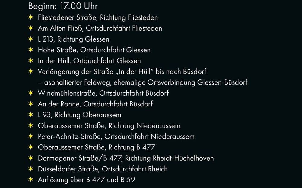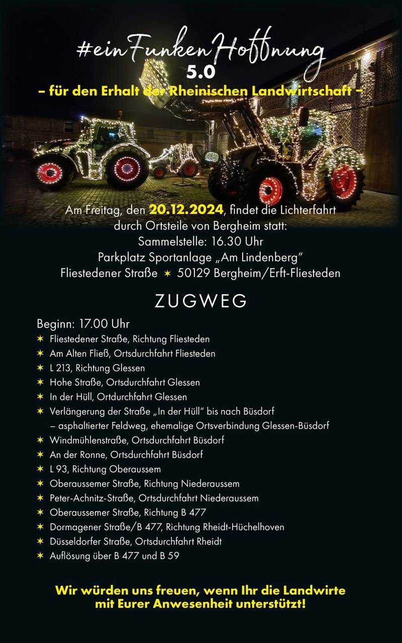 Am Freitagabend (20. Dezember) ziehen wieder bunt beleuchtete Traktoren durch die Straßen von Bergheim und verbreiten unter dem Motto „Ein Funken Hoffnung für die rheinische Landwirtschaft“ festliche Stimmung. Die Lichterfahrt startet um 17 Uhr in Fliestedten und führt die Traktoren über Glessen, Büsdorf und Niederaussem bis nach Rheidt-Hüchelhoven. Die vollständige Route gibt es auf dem Foto weiter unten.