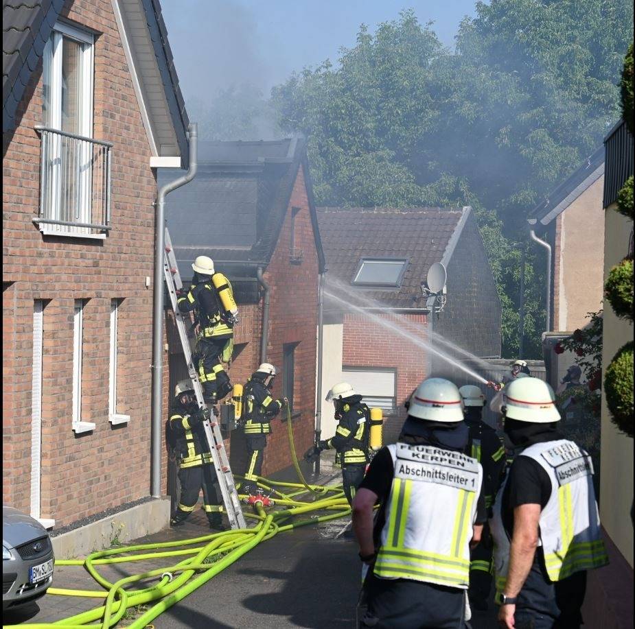Mittwochmorgen war am Rosenpfad ein Brand in einer Garage ausgebrochen – und die Flammen griffen auf zwei angrenzende Wohnhäuser über. Die Löscharbeiten waren sehr schwierig, die Flammen in den beiden Dachstühlen schwer erreichbar waren. Es dauerte rund zweieinhalb Stunden, bis das Feuer unter Kontrolle war. Zeitweise waren rund 100 Einsatzkräfte und diverse Spezialfahrzeuge vor Ort – darunter auch Personal und Equipment aus Bergheim und Frechen. Eine Kraft der Feuerwehr wurde bei dem Einsatz verletzt, die Bewohner waren rechtzeitig aus den Häusern raus.