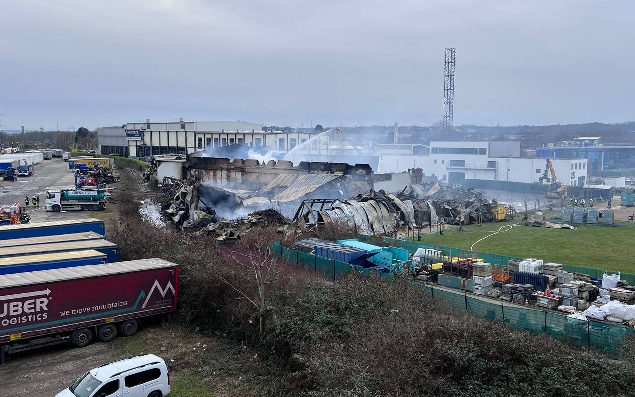 Nach dem Brand von Lagerhallen in Hürth-Kalscheuren entspannt sich die Lage langsam. Am Dienstagnachmittag (27. Januar) haben das Technische Hilfswerk (THW) und ein Abbruchunternehmen damit begonnen, beschädigte Gebäudeteile abzutragen.