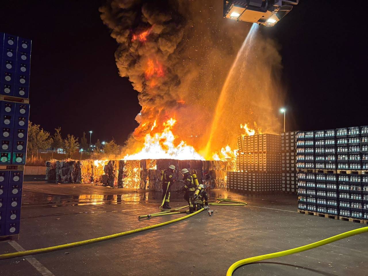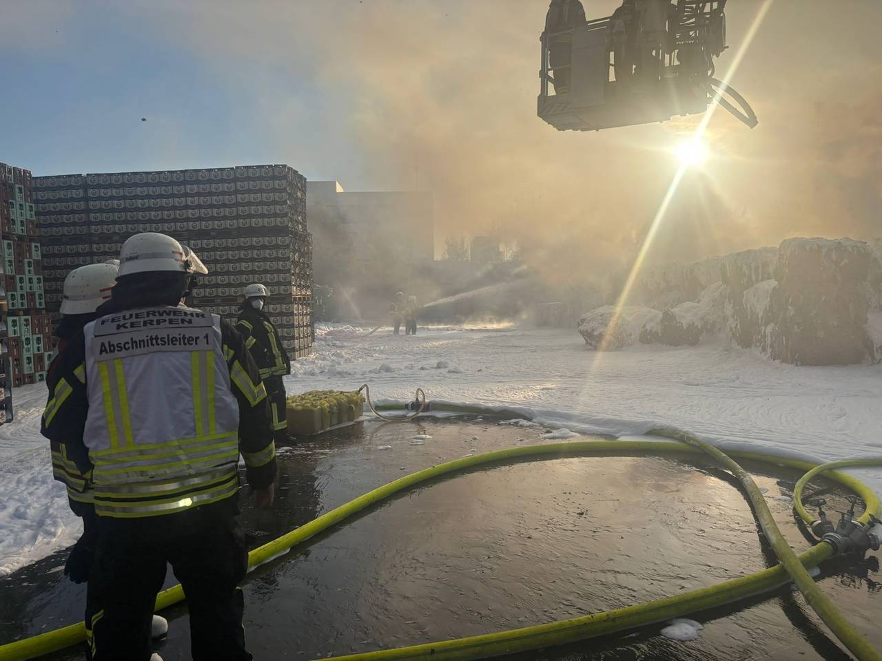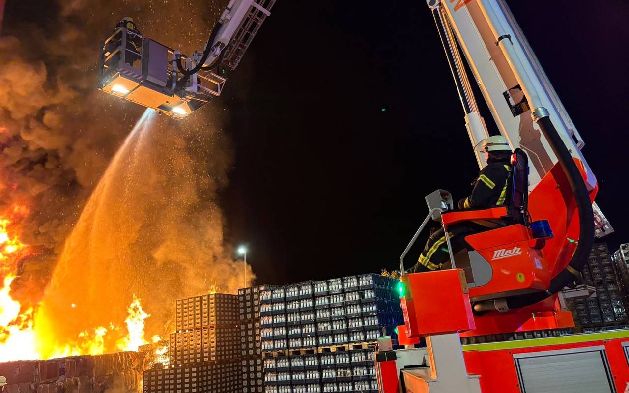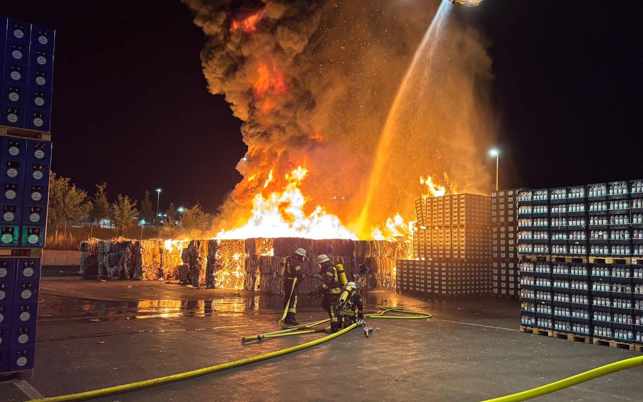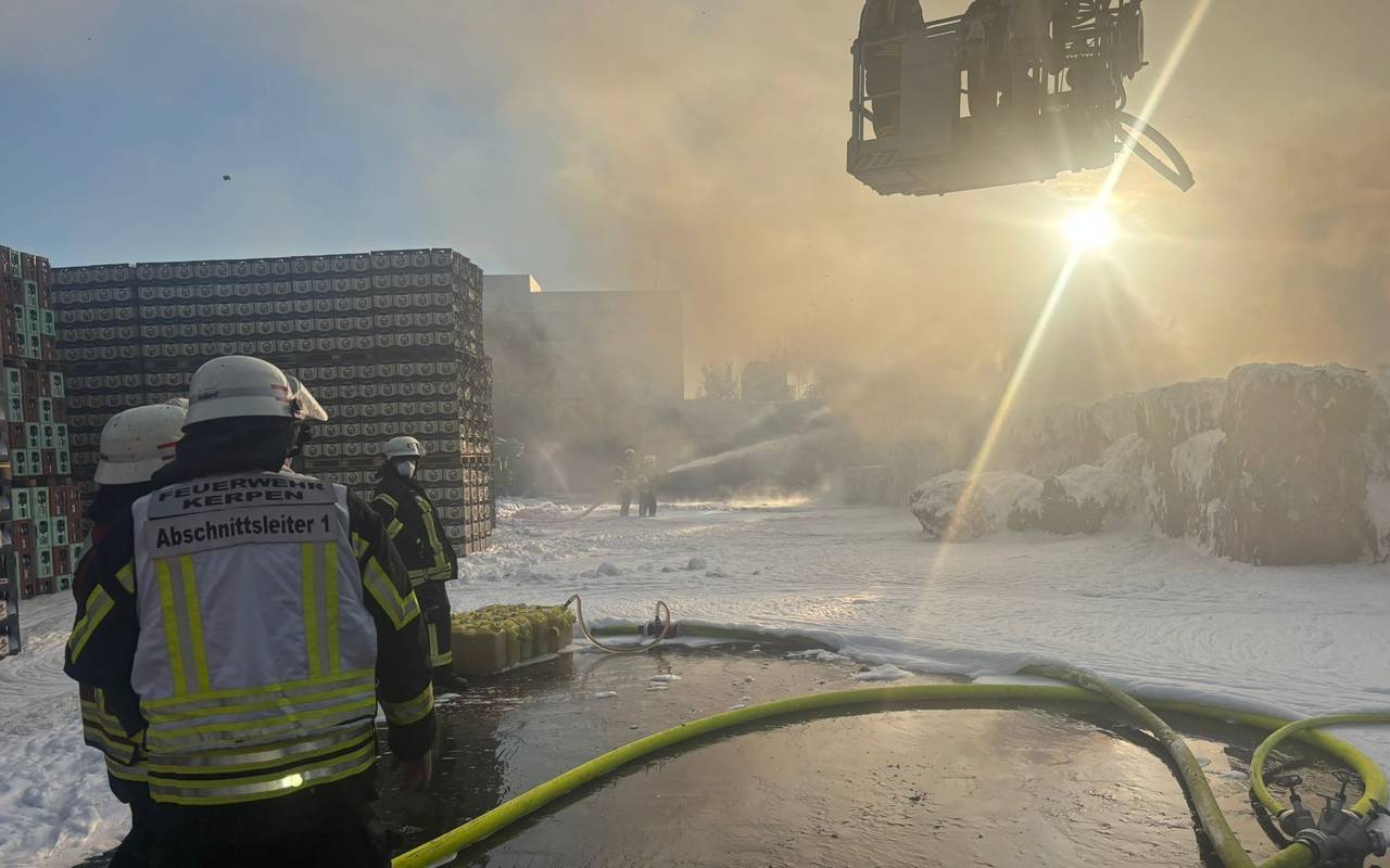 In Kerpen-Türnich brannte seit der Nacht auf Montag Plastikmüll auf dem Gelände einer Logistikfirma. Fast 100 Kräfte waren stundenlang im Einsatz.