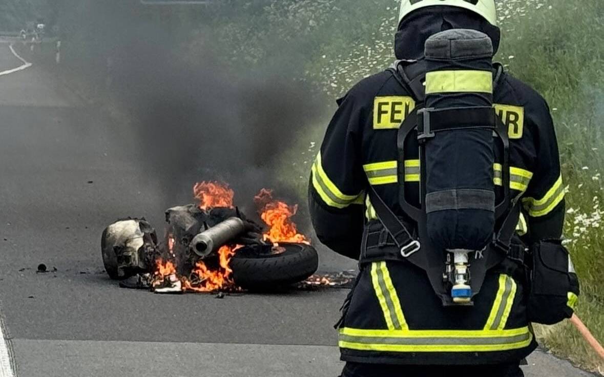 Die Feuerwehr konnte das brennende Motorrad schnell löschen. Nach Angaben der Polizei war vermutlich ein technischer Defekt der Auslöser des Brandes. Der Fahrer blieb unverletzt.