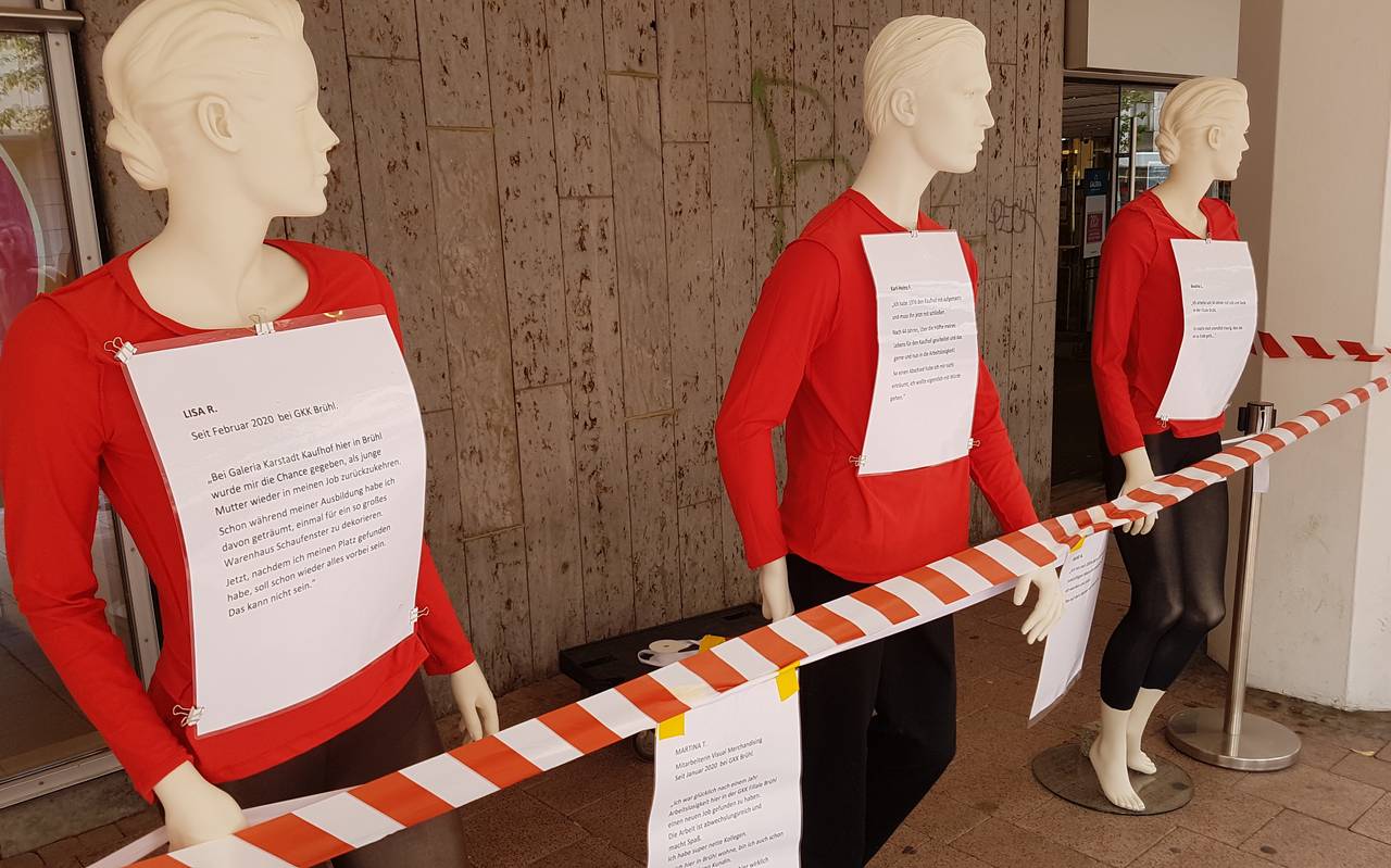 In der Brühler City gibt es am Freitag und Samstag eine Protest-Aktion der Galeria-Kaufhof Mitarbeiter. Sie haben vor dem Eingang der Filiale am Steinweg Schaufensterpuppen mit Absperrband aufgestellt.