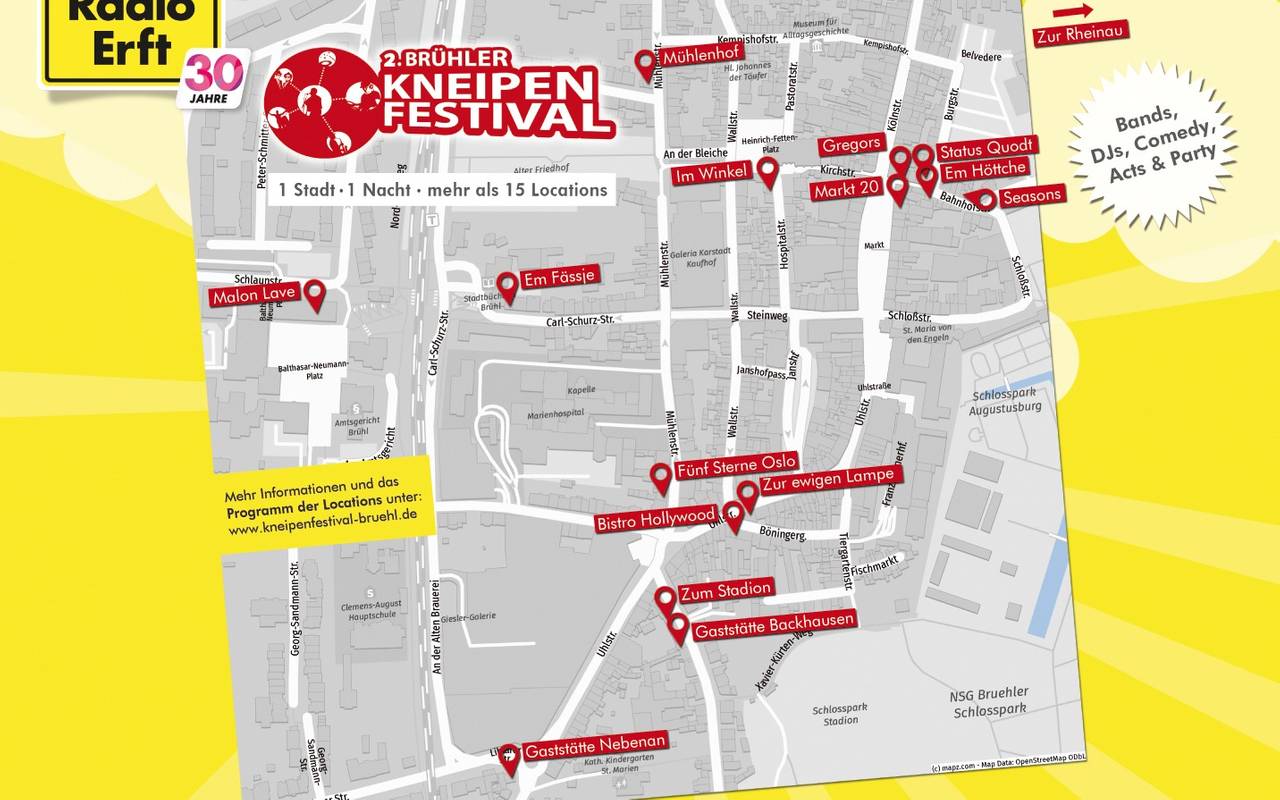 Den ganzen Abend lang treten dann 22 lokale Bands und Künstler in 16 Brühler Kneipen, Bistros und Restaurants auf. Außerdem gibt es ein Konzert in einem Bus der REVG, der durch die Stadt fährt. Nach dem großen Erfolg des ersten Kneipenfestivals vor drei Jahren rechnen die Veranstalter auch dieses Jahr wieder mit mehreren tausend Besuchern. Der Eintritt zu allen Locations, Kneipen und Music-Acts ist den ganzen Abend lang kostenlos. Präsentiert wird das Festival von Radio Erft. Eine Liste mit allen teilnehmenden Kneipen und Künstlern gibt es HIER!