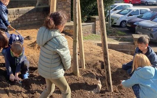 Kinder pflanzen Baum des Jahres an einer Kita in Brühl