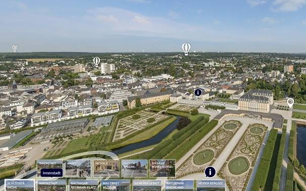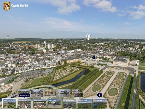 Brühl erweitert sein digitales Angebot um einen virtuellen Rundgang. Zu sehen sind 360-Grad-Bilder von Sehenswürdigkeiten, Natur und Innenstadt - aufgenommen aus der Luft und vom Boden.