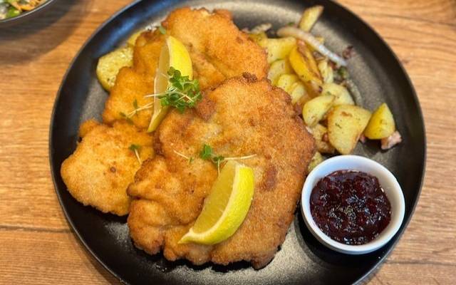 Die Tapas-Vorspeisenplatte beinhaltete Klassiker, aber überall gab es eine kleine persönliche Note, die es am Ende doch anders machte. Karin war ganz begeistert und dabei kam das Highlight noch: Wiener Schnitzel mit einer Panade, die so wellig aufgegangen war, dass es eine Freude war, auch schon vor dem ersten Bissen. Es gibt kaum noch Restaurants, die sich in Zeiten von Personalmangel und Kostendruck so eine Mühe machen. Das hat man bei jedem Gericht gemerkt. Besucht gerne mal den Brühler Hof und vielleicht ist es auch interessant für eine größere Feier, denn es gibt nach hinten auch noch einen großen Saal.