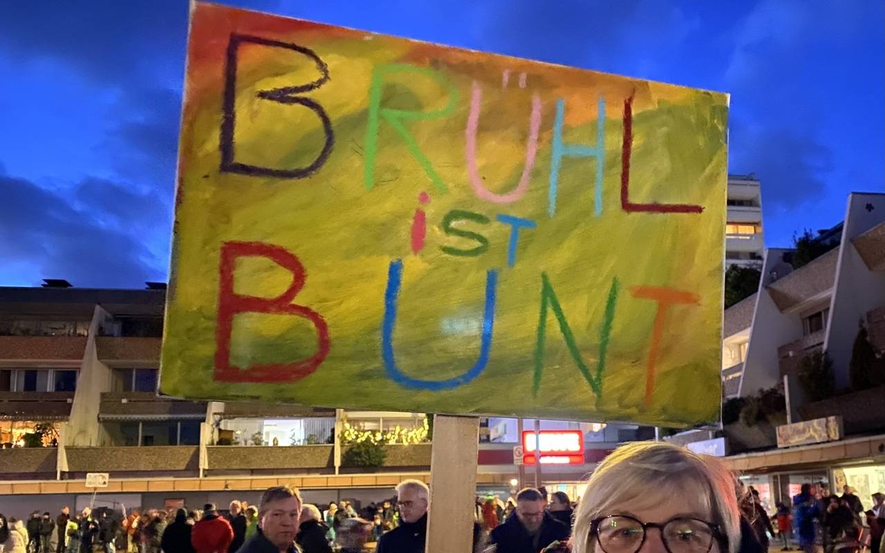 „Unsere Zukunft ist bunt“, „Brühl ist bunt“ – das und vieles mehr war bereits am Freitag auf den Plakaten bei der Demo gegen Rechts in Brühl zu lesen. Rund 300 Teilnehmer waren vom Veranstalter angemeldet. Gekommen sind deutlich mehr – laut Polizei zogen mehr als 2500 Menschen friedlich durch die Brühler Innenstadt. Die Organisatoren gehen von etwa 5000 Teilnehmern aus. Der Demonstrationszug vom Balthasar-Neumann-Platz zum Rathaus war teilweise so lang, dass er an der Bahnschranke halten und mehrfach geteilt wurde, berichten Teilnehmer. Aufgerufen zu den Protesten hatte unter anderem das Bündnis „Gemeinsam für Brühl“, alle demokratischen Brühler Parteien, die Kirchen und viele Vereine.