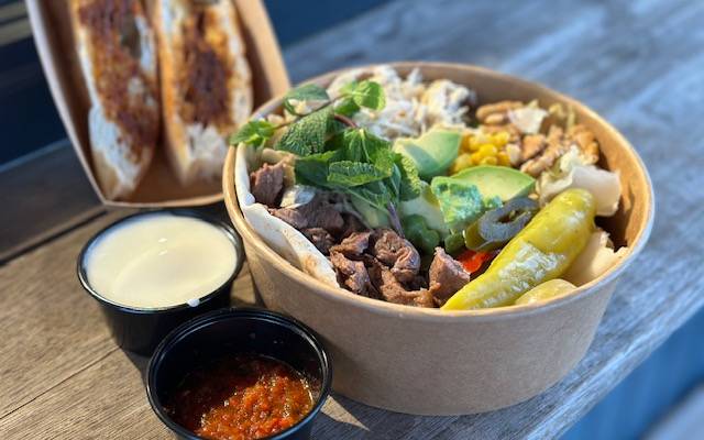Ein großer Topf Reis, dann kommt Hühnchen darauf und etwas Gemüse, wie z.B. Mais, Paprika oder auch Avocado und Minze. Dazu entweder Jogurt oder die rote, scharfe Sauce. Fertig ist eine Mahlzeit, die satt macht und recht ausgewogen ist. Das Highlight ist aber nach Meinung unserer Gastrobloggerin Karin der Imbiss selbst. Denn an der Seite führt eine Treppe aufs Dach und im Sommer, wenn die Treppe eröffnet wird, wird man hier herrlich thronen können, mit der Bowl in der Hand, inmitten des Industriegebietes. Eine schnuckelige Idee.