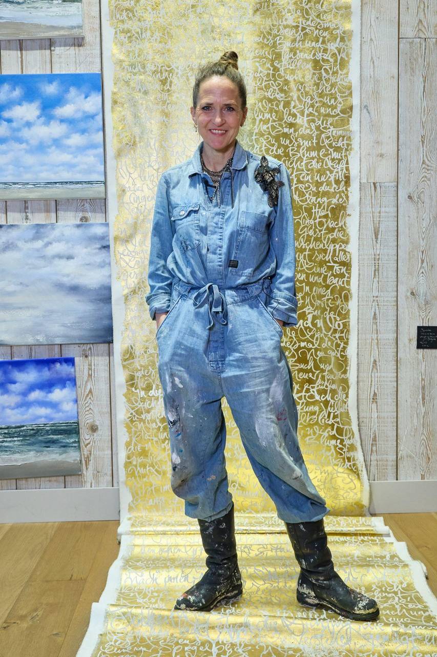In ihrem Atelier am Alten Wall in der Nähe des Hamburger Rathauses hat Jeannine Platz in einem kleinen Extra-Raum ein Regal mit unzähligen Stiften, Federhaltern, Tintenfässern und Federspitzen. Der Raum ist über und über mit Karten, Einladungen und Blättern beklebt. Und auf allen ist ihre Handschrift zu finden. In ihrem großen, hellen Atelier finden sich zudem die Bilder, die sie auf die große Leinwand gebracht hat. Auch hier ist ihre Handschrift immer wieder Teil des Kunstwerks. «Das war immer gleichwertig bei mir. Es hat gleichzeitig angefangen. Es ist irgendwie dasselbe.»