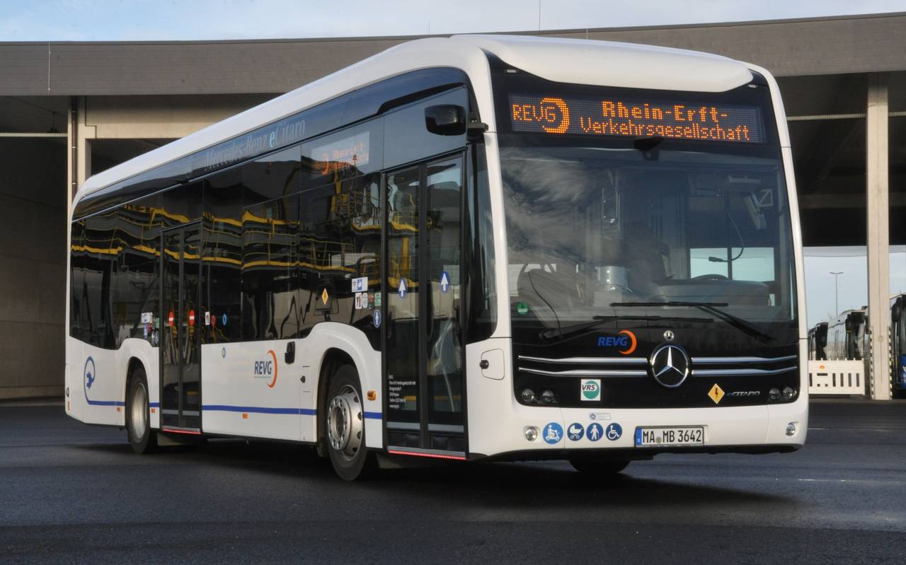 Seit Dezember fährt ein vollelektrischer Linienbus der REVG durch den Rhein-Erft-Kreis. Der Mercedes eCitaro ist komplett emissionsfrei unterwegs – sogar die Heizung des Busses arbeitet ohne fossile Energie. Mit einer Batteriekapazität von über 600 kWh kann der Bus flexibel auf verschiedenen Linien eingesetzt werden. Die REVG möchte mit dem neuen Elektrobus Erfahrungen sammeln, um zu prüfen, wie sich diese Technologie im Alltag bewährt. Auf dem Betriebshof stehen bereits zwei Schnellladesäulen bereit, um den Bus bei Bedarf zügig wieder aufzuladen. Der Elektrobus ergänzt die bestehende Flotte der REVG, die bereits 26 Brennstoffzellen-Hybridbusse umfasst. Damit ist ein Fünftel des Fuhrparks emissionsfrei. Langfristig plant die REVG, Dieselbusse vollständig durch Fahrzeuge mit alternativen Antrieben zu ersetzen.