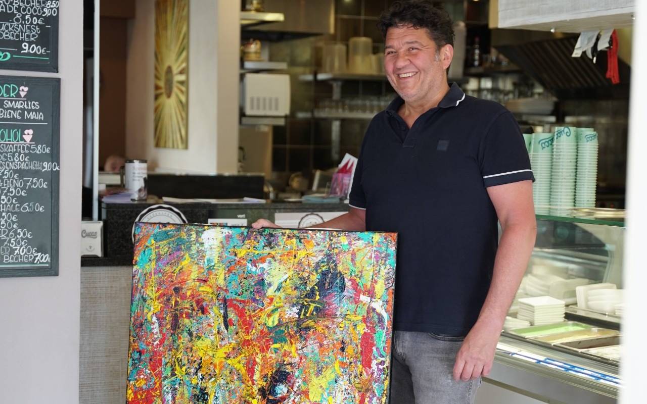 Lorenzo Cucco aus Elsdorf ist bisher für sein Eis bekannt, künftig vermutlich auch für seine Kunst. Tagsüber betreibt er eine Eisdiele in Elsdorf, doch in seiner Freizeit hat er das Malen für sich entdeckt. Seine Werke beschreibt er als abstrakt, doch bei genauerem Hinsehen lassen sich immer wieder Motive erkennen.