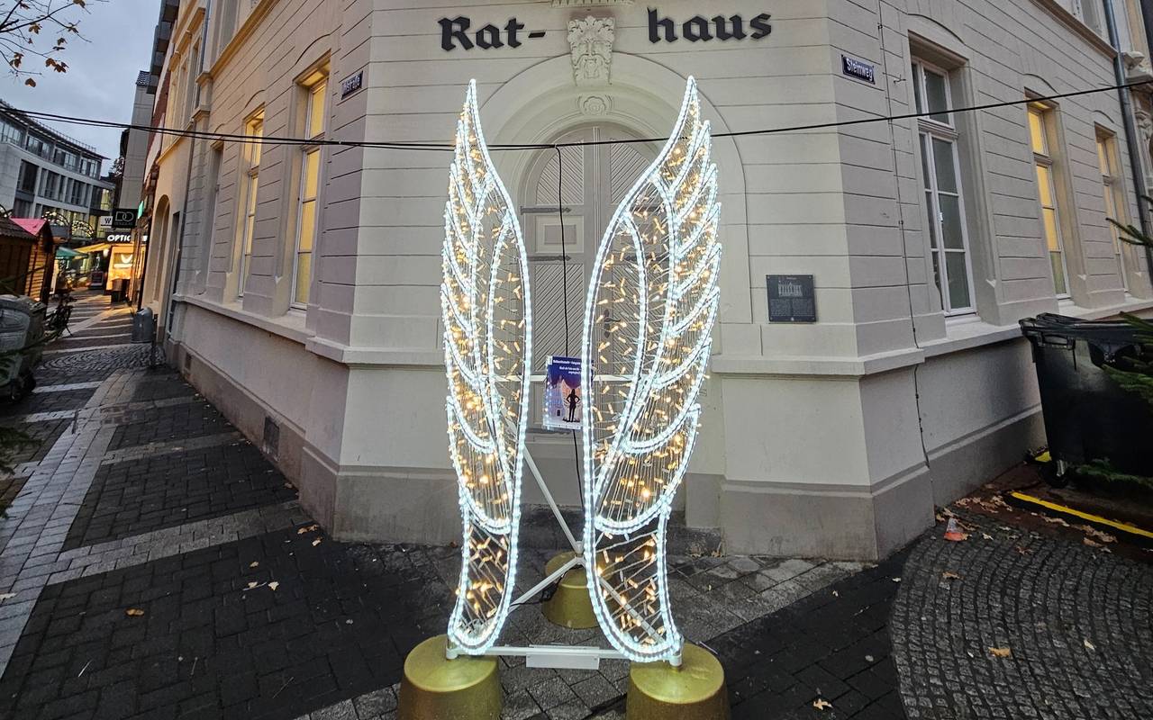 Auf dem Weihnachtsmarkt in Brühl gibt es eine neue Attraktion: Zwei leuchtende Engelsflügel laden Besucher zum Fotografieren ein. Die Stadt Brühl hofft, dass viele hier einen Weihnachts-Schnappschuss machen.