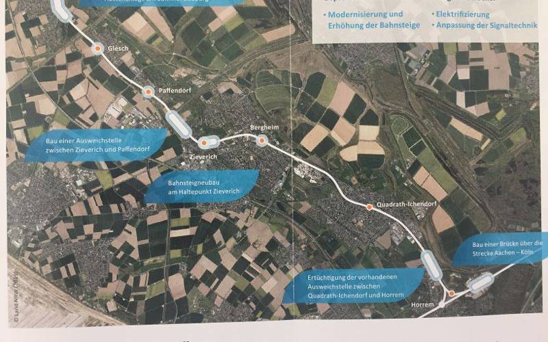 Konkret heißt das: die geplante, neue S12 fährt zwischen Bedburg und Au an der Sieg alle 20 statt bisher 30 Minuten und das mit 100 statt bisher 60 Stundenkilometern, heißt es unter anderem vom Nahverkehr Rheinland. Dazu muss in den kommenden Jahren einiges an der Signaltechnik auf der Strecke getan werden. Und auch an den Bahnsteigen. Der in Bedburg soll verlängert werden. Alle anderen werden für die S-Bahn erhöht und modernisiert und in Zieverich soll ein neuer Bahnsteig gebaut werden. Außerdem müssen die Ausweichstellen auf der Strecke zwischen Quadrat-Ichendorf und Horrem und zwischen Zieverich und Paffendorf angepasst, bzw. neu gebaut werden.