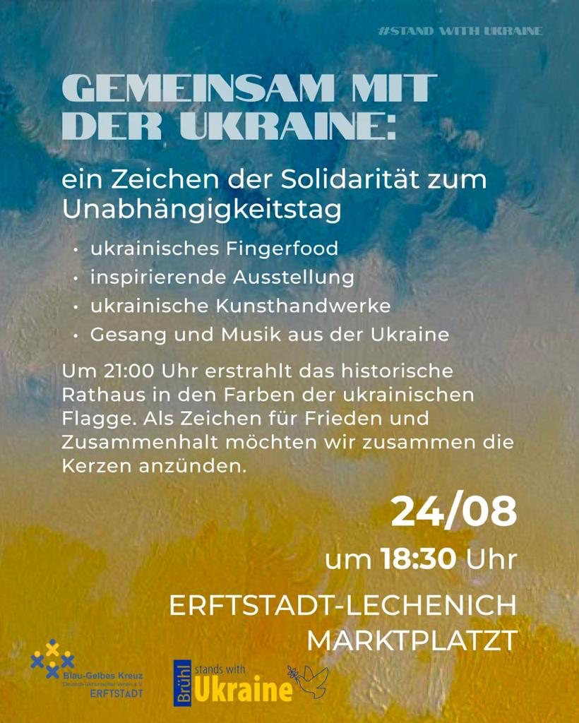 Ab 18:30 Uhr startet dazu eine Veranstaltung auf dem Marktplatz in Lechenich. Denn gerade zum Unabhängigkeitstag der Ukraine am 24. August sei es besonders wichtig zu zeigen, dass die Ukraine auch hier unterstützt wird, heißt es von den Organisatoren. Um die Solidarität besonders deutlich sichtbar zu machen, soll auch das historische Rathaus gegen 21 Uhr in den Farben der ukrainischen Flagge angestrahlt werden. Vorher gibt es auf dem Marktplatz auch ukrainisches Fingerfood und Gesang und Tänze aus der Ukraine.