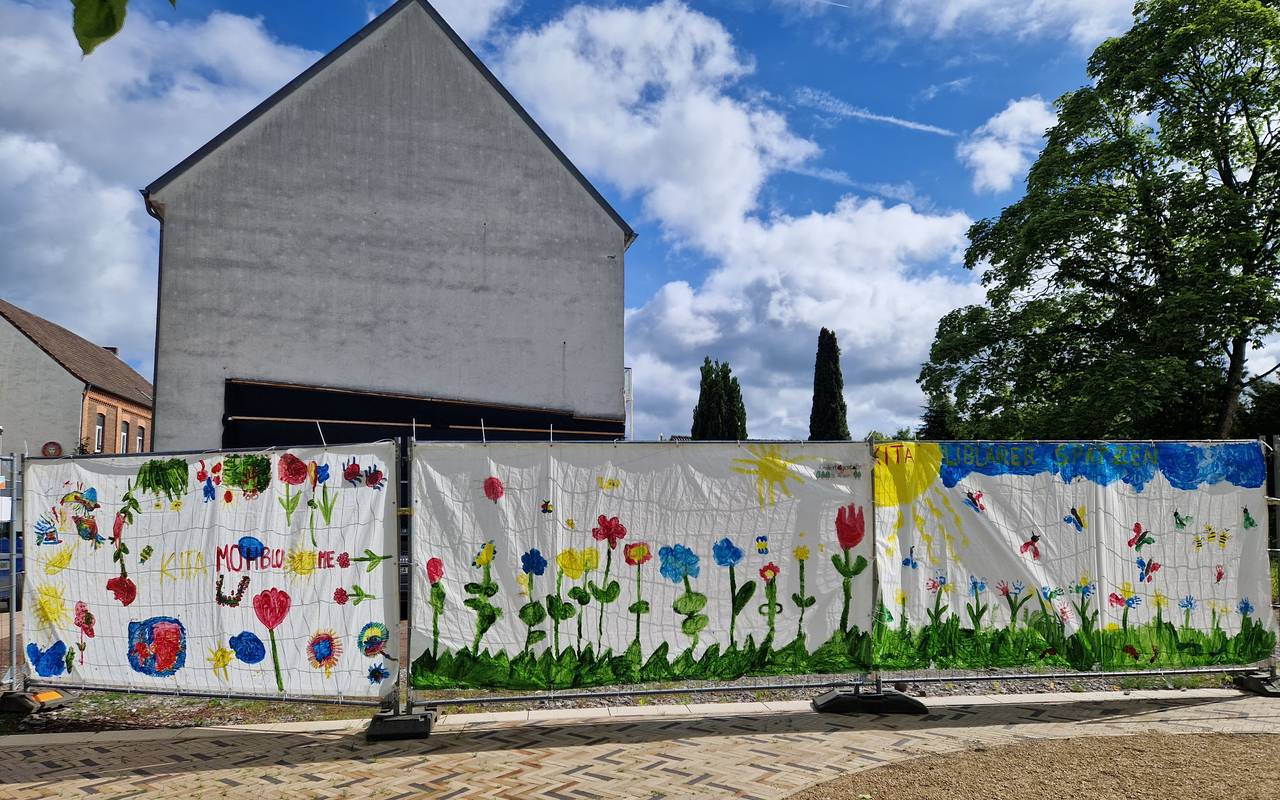 Wer am Carl-Schurz-Platz in Erftstadt-Liblar vorbeigeht, sieht dort an der Baustelle bunte Planen an den Bauzäunen. Die Planen wurden von Kindern der Kita Mohnblume, St. Alban und der Liblarer Spatzen bemalt.