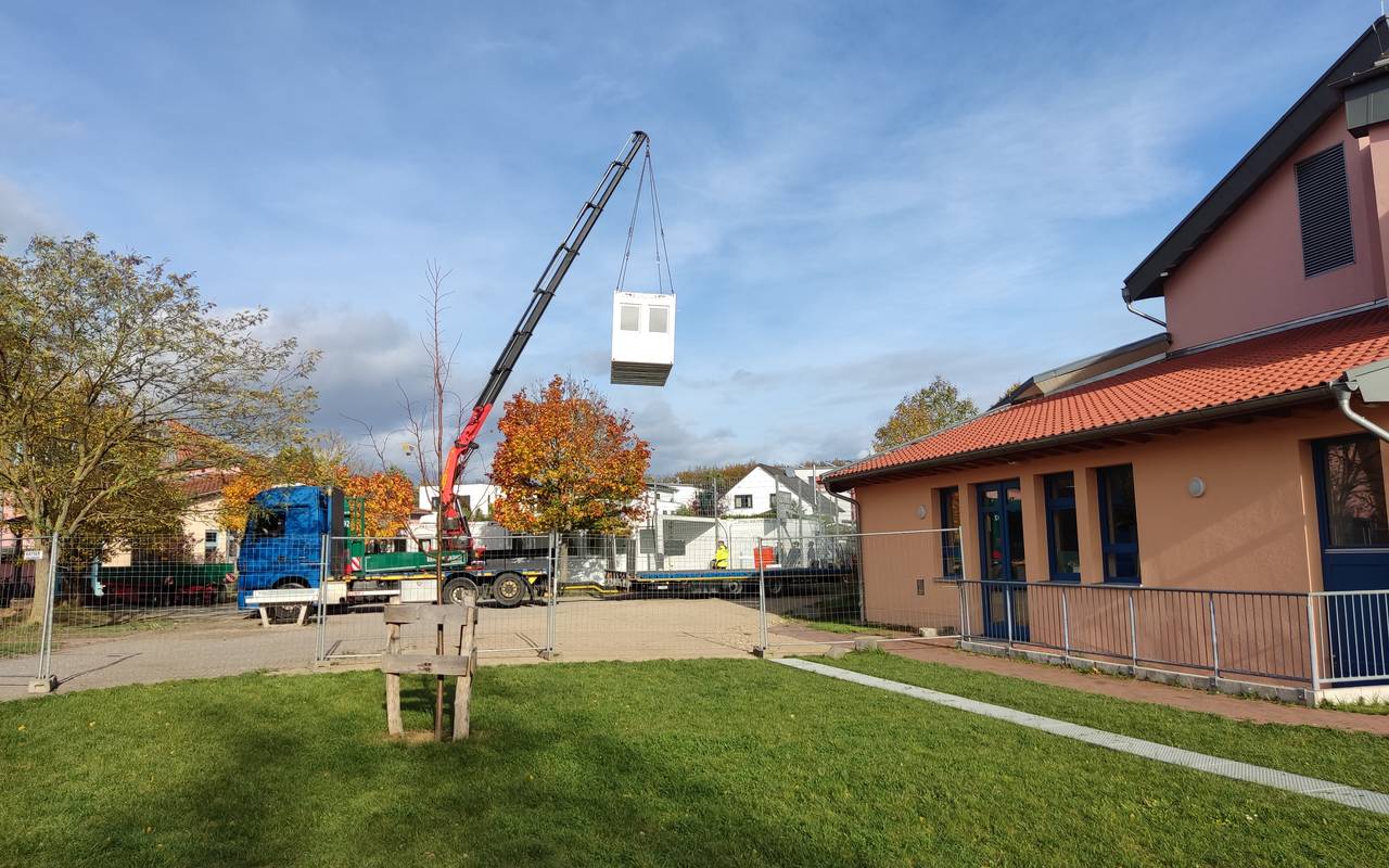 Nach dem schweren Brand an der Waldorfschule in Erftstadt-Liblar können einige Schülerinne und Schüler in Containern unterrichtet werden. Sie wurden nach Angaben des Schulleiters am Freitag aufgebaut.