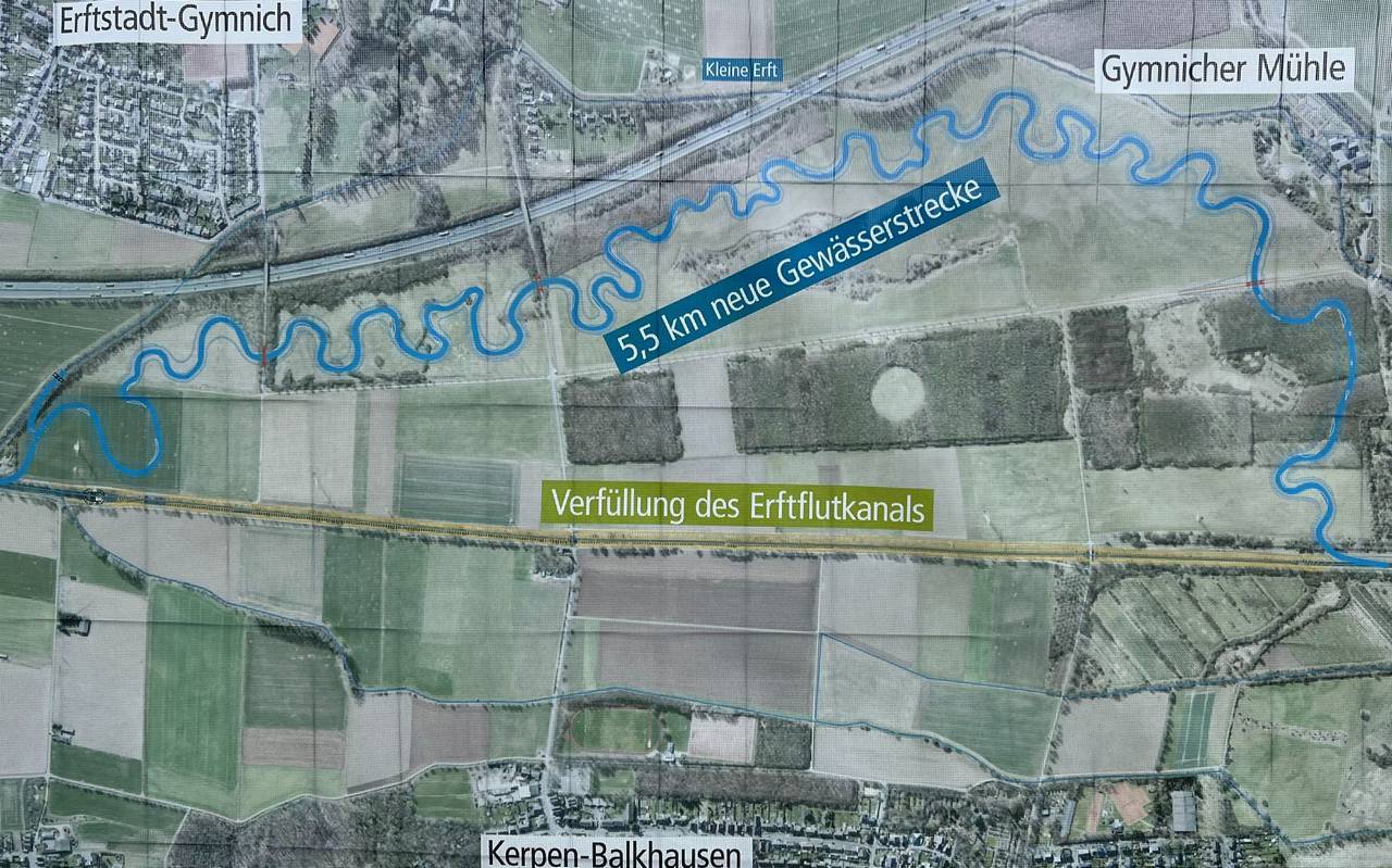 Um die Artenvielfalt um und in der Erft wieder herzustellen, schaufeln deshalb jetzt Bagger ein neues Bett, in das der Fluss nach Fertigstellung umgeleitet werden soll. Neben dem Umweltschutz bietet die Renaturierung auch Vorteile für den Hochwasserschutz. Der Fluss ist hier dann drei Kilometer länger und kann so mehr Wasser führen. Die Kosten für die Arbeiten belaufen sich auf rund zehn Millionen Euro, das Land NRW übernimmt davon 80 % Prozent. Wenn alles nach Plan läuft, soll in gut einem Jahr alles fertig sein.