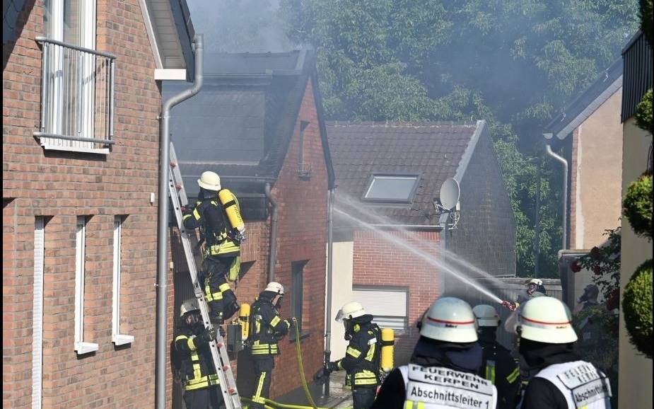 Das Feuer am Rosenpfad in Kerpen-Blatzheim ist inzwischen unter Kontrolle. Viele Kräfte sind abgerückt und es laufen nach Feuerwehrangaben die Nachlöscharbeiten. Wie lange die dauern werden, könne man nicht sagen, das hänge davon ab, wie gut man an die Glutnester in den Dachstühlen herankomme. Im Moment prüfen Experten vom THW, ob die Häuser einsturzgefährdet sind.