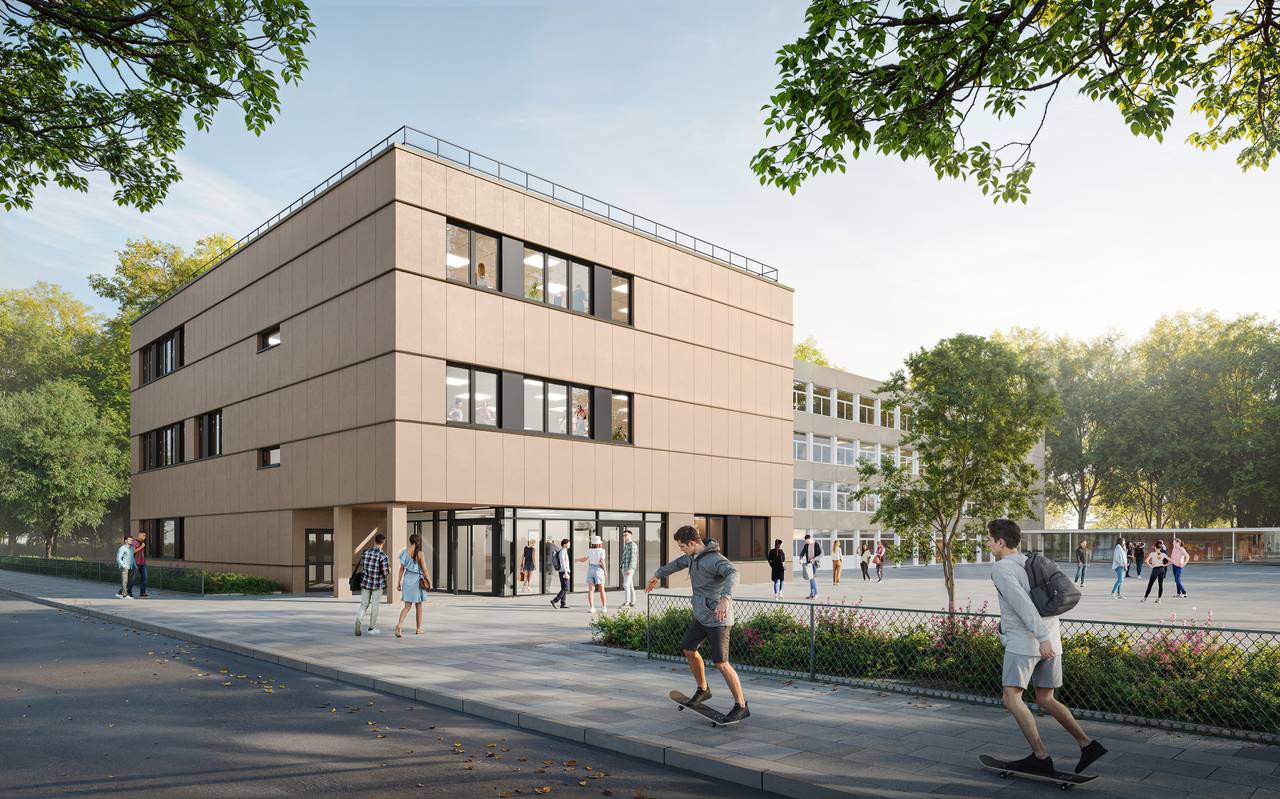 Die Erweiterung besteht aus zwei Gebäuden, die in Modulbauweise errichtet werden. Für die Klassenräume wird ein dreistöckiges Gebäude gebaut, während die neuen Räume für Biologie, Chemie und Physik in einem eingeschossigen Neubau untergebracht werden.