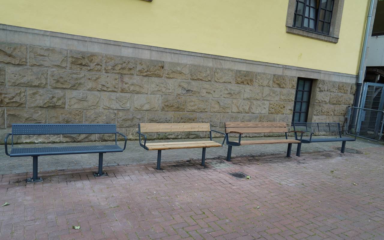 Wie sollen die Bänke und Mülleimer in der Frechener Fußgängerzone aussehen? Das wird jetzt ausprobiert. An der Nordseite des alten Rathauses und am VHS-Gebäude sind dafür jetzt verschiedene neue Bänke mit Holz oder ganz aus Metall installiert worden.