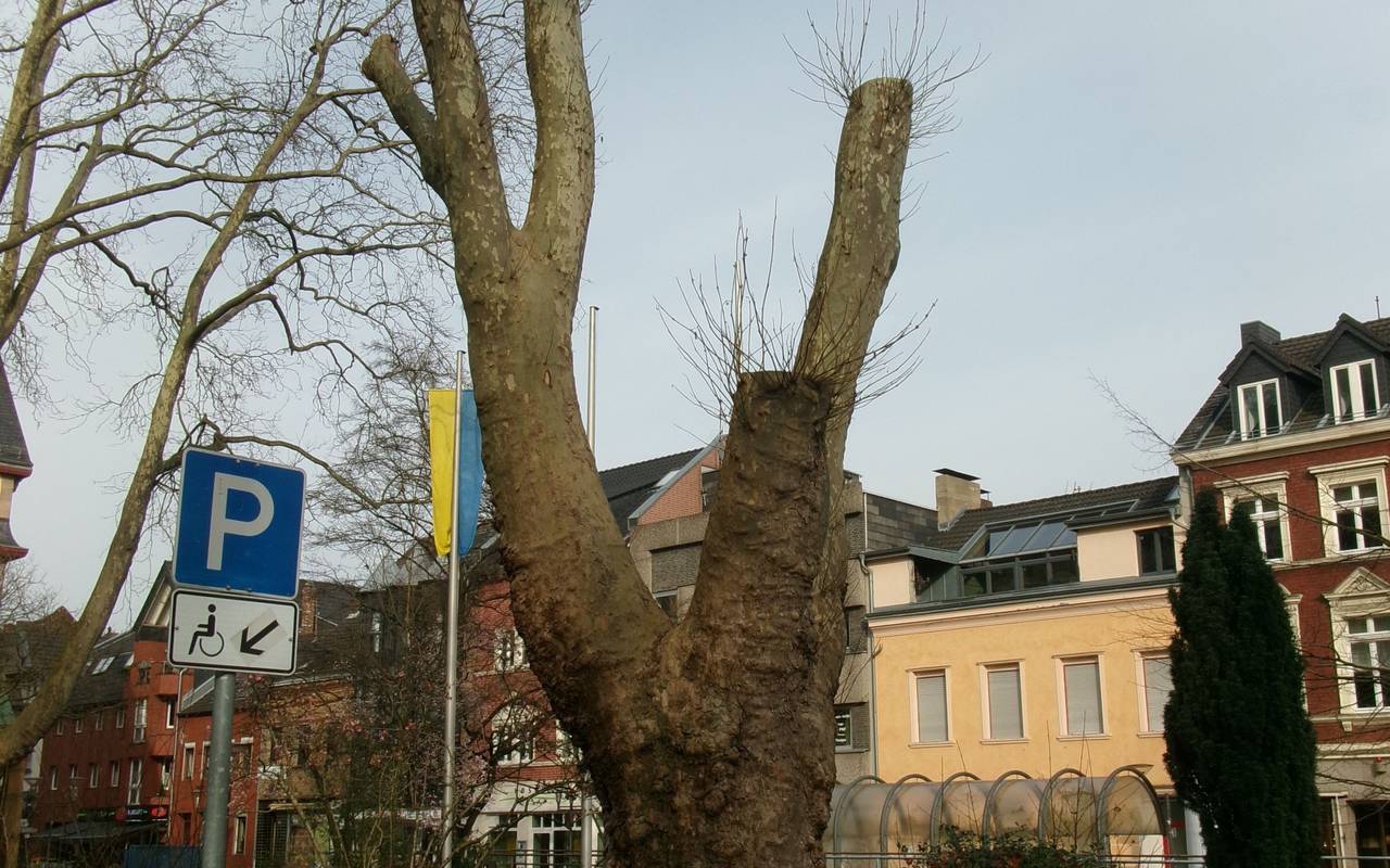 Die zwei Platanen mussten nach einem Sturm Ende Juli stark beschnitten werden. Ein langfristiger Erhalt der Bäume an dem Standort ist laut Stadt nicht möglich. Das wäre mit einem hohen Kosten- und Pflegeaufwand verbunden. Außerdem stünde es einer Neugestaltung der Grünanlage vor dem Rathaus entgegen.