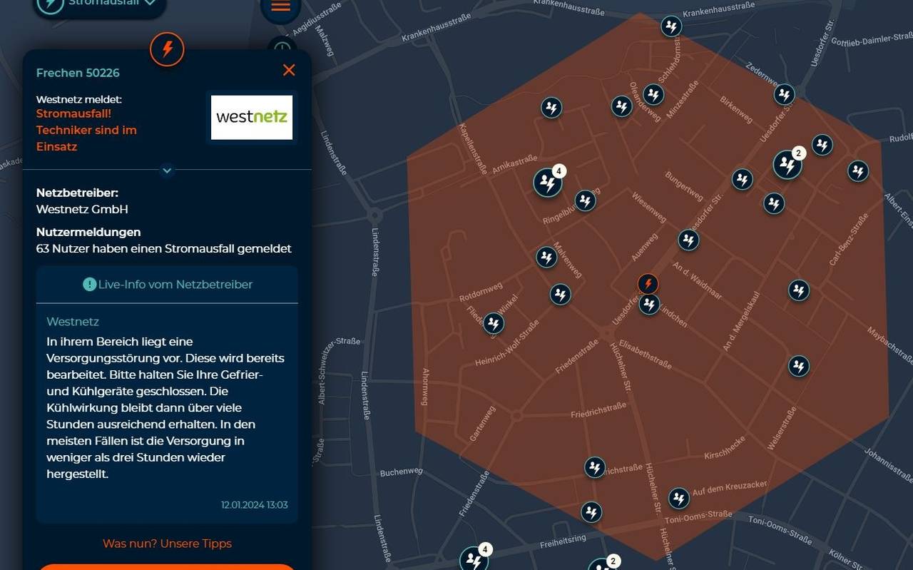 Anwohner wurden gebeten, ihre Gefriertruhen und Kühlschränke nicht zu öffnen, um die Lebensmittel zu schützen. In den meisten Fällen sei die Versorgung in weniger als drei Stunden wieder hergestellt, heißt es. Um 15 Uhr war dann in ganz Frechen der Strom wieder da. Grund für den Stromausfall war offenbar eine Verpuffung in einem Elektroverteiler in der Friedenstraße.