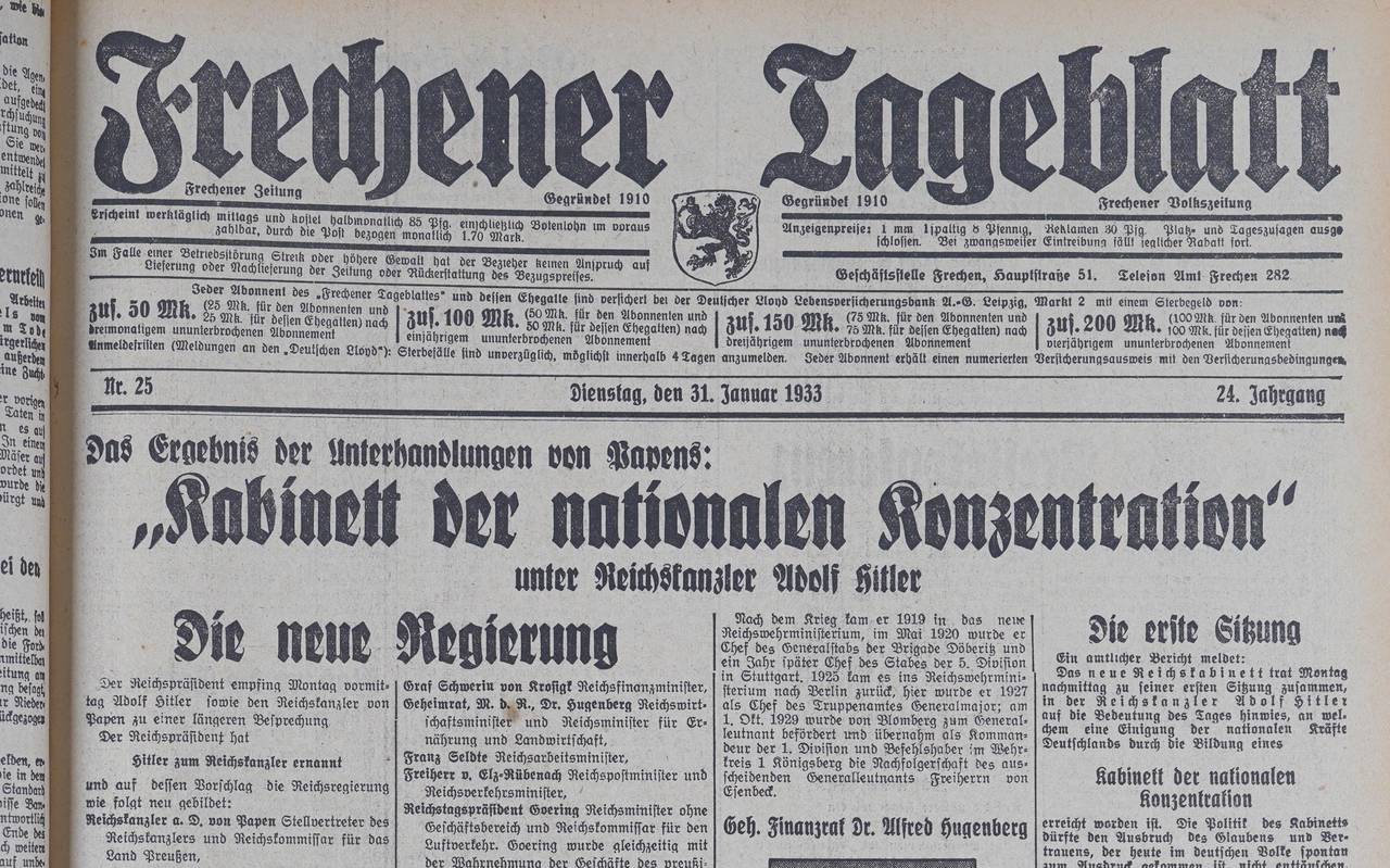 Die Machtergreifung wird nicht nur im großen Rahmen betrachtet. Die Vortragenden gehen auch der Frage nach, wie sich das Ereignis in Frechen darstellte. Los geht es Mittwoch um 20 Uhr, der Eintritt ist frei. Interessierte sollen sich anmelden, das geht Mail an archiv@stadt-frechen.de oder telefonisch unter 02234-501-1239.