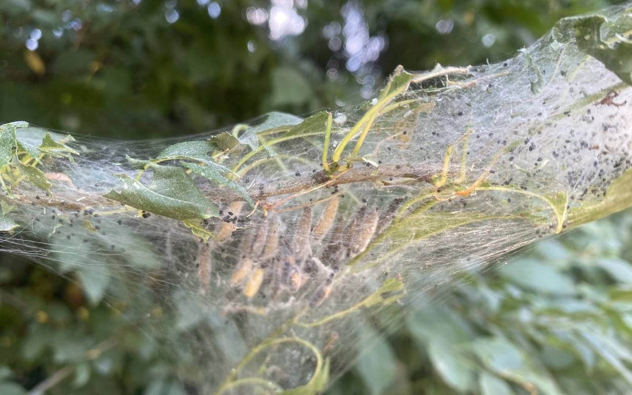 Im Rhein-Erft-Kreis sind derzeit viele Büsche und Bäume von Gespinstmotten eingesponnen, deren Raupen die Blätter fressen und die Pflanzen mit ihrem Gespinst überziehen. Laut dem Naturschutzbund sind die Raupen ungefährlich und schaden den Bäumen und Sträuchern nicht.