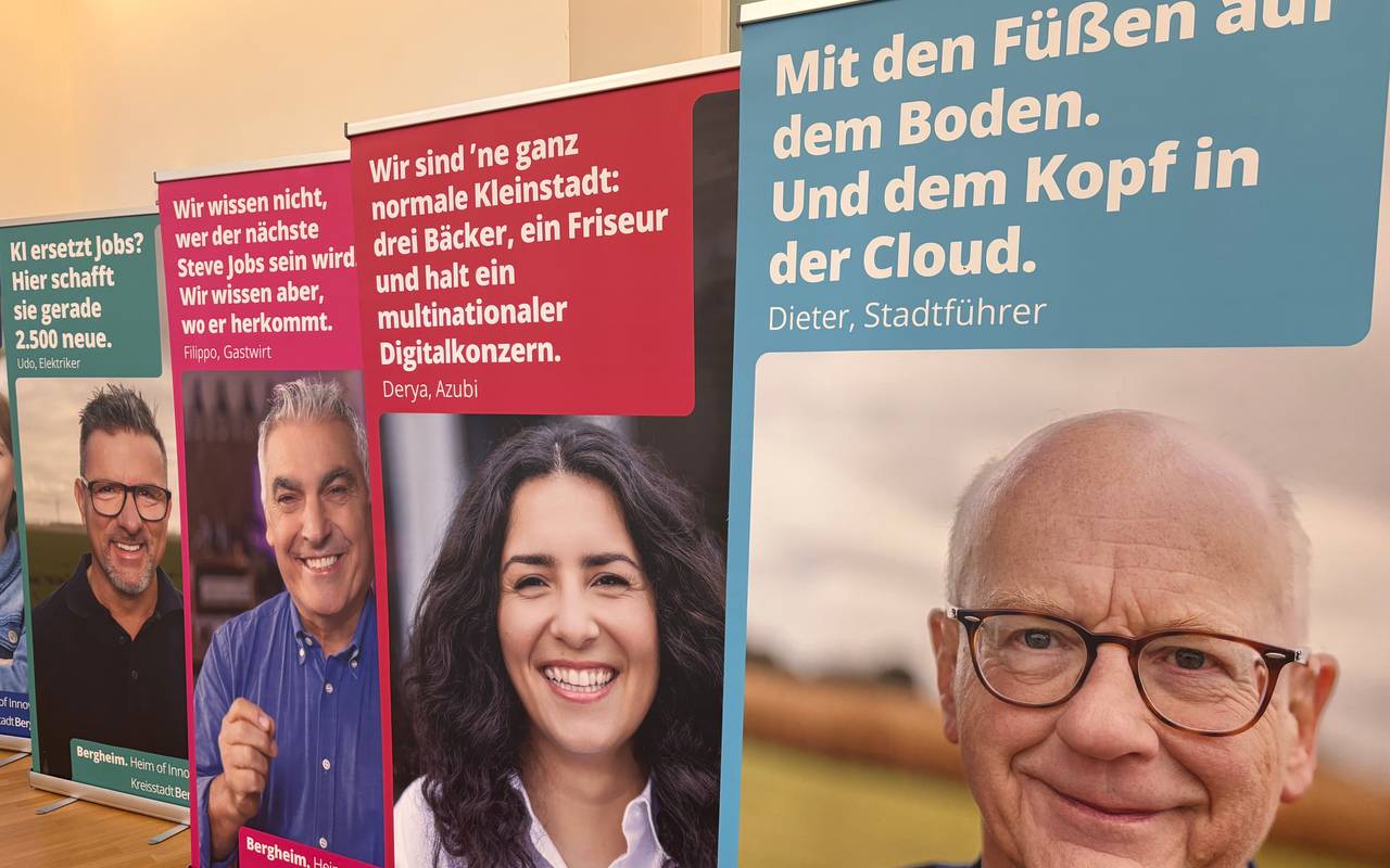 Bergheim startet eine neue Imagekampagne und rückt dabei die Themen KI und Digitales in den Mittelpunkt. Am Mittwoch (18. März) wurde die Kampagne offiziell vorgestellt. Die Plakate hängen in allen Bergheimer Stadtteilen, außerdem am Kölner Hauptbahnhof und am Flughafen Köln/Bonn.
