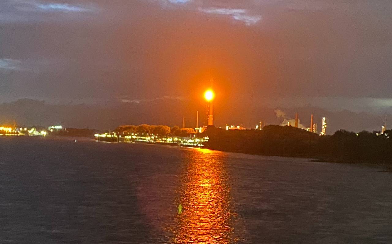 Rund um das Gelände von Shell in Godorf ist am Mittwochabend eine der Hochfackeln deutlich sichtbar. Der helle Fackelschein ist auch aus einiger Entfernung wahrnehmbar, melden Radio Erft Hörer.