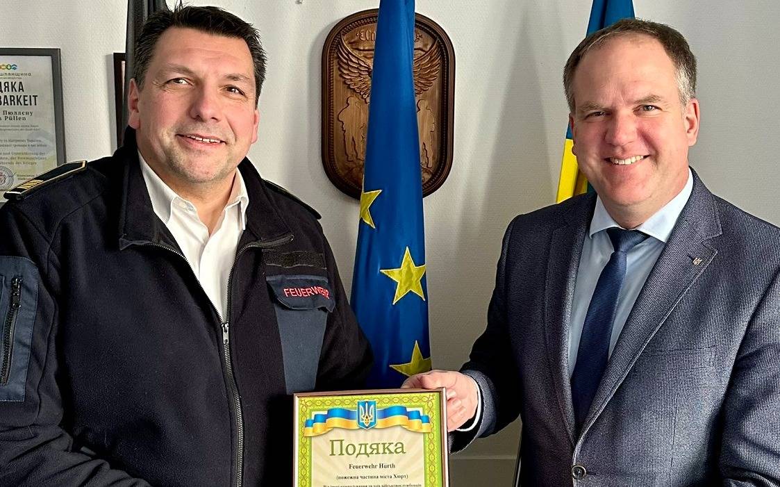 Mit der Urkunde aus der Ukraine sollen die Hilfeleistungen und das Engagement der Hürther Feuerwehr im Zivil- und Katastrophenschutz in den vergangenen zwei Jahren gewürdigt werden. So hat die Hürther Feuerwehr mehrere Hilfs- und Spendenaktionen durchgeführt. Dabei haben einige Mitglieder zum Teil auch persönlich an den Hilfstransporten in die Ukraine teilgenommen. Beispielsweise hat die Feuerwehr in der Hürther Partnerstadt Peremyschljany ein Mannschaftstransportfahrzeug und ein von Yncoris gespendetes Drehleiterfahrzeug bekommen. Der Hürther Bürgermeister Dirk Breuer hat die Urkunde stellvertretend für alle Feuerwehrleute an den Leiter der Hürther Feuerwehr Michael Mund übergeben.