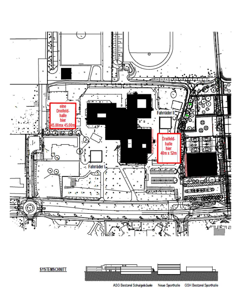 Zwei Dreifach-Hallen in der Nähe des Schulgebäudes geplant