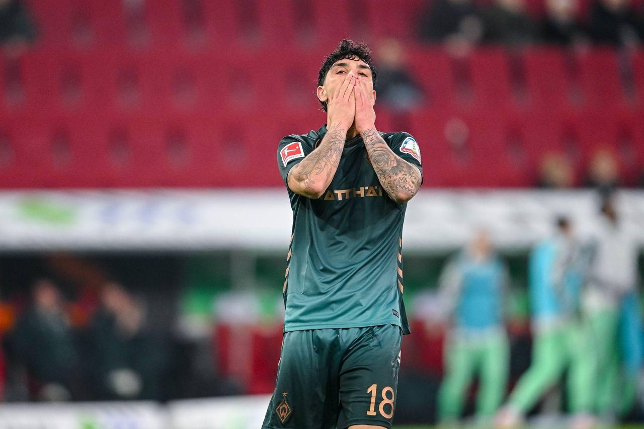 Bremens Cameron Puertas reagiert nach einer vergebenen Chance. Sein Schuss flog über das Augsburger Tor.