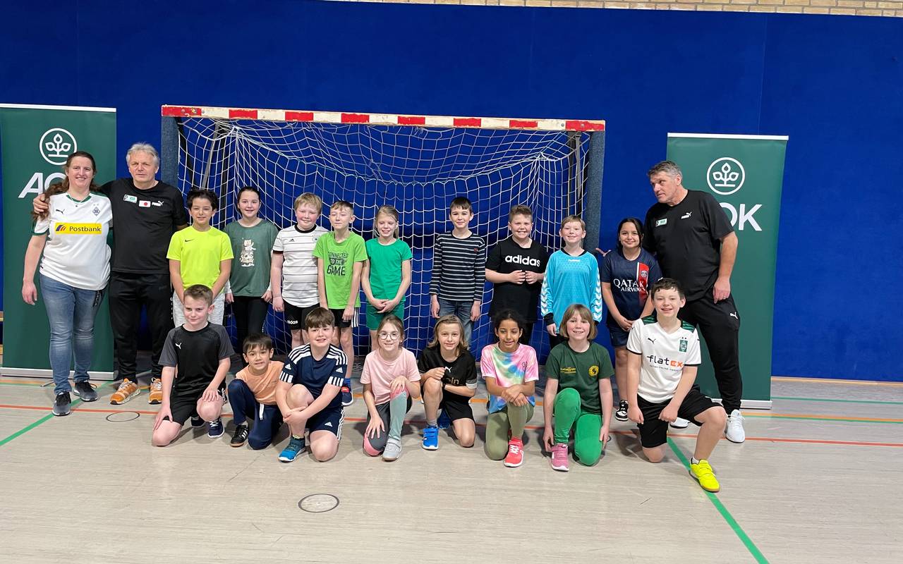 Die Ex-Fußballprofis Marcel Witeczek und Michael Klinkert haben die Dritt- und Viertklässler der Albert Schweitzer Grundschule in Kerpen Brüggen trainiert. Zusammen mit der AOK besuchen die beiden ehemaligen Fußballer von Borussia Mönchengladbach schon seit Jahren die Grundschulen und wollen den Schülern Spaß am Sport vermitteln. Das findet auch Schulleiterin Susanne Klein wichtig, da ihrer Ansicht nach immer weniger Kinder intensiv Sport machen.
