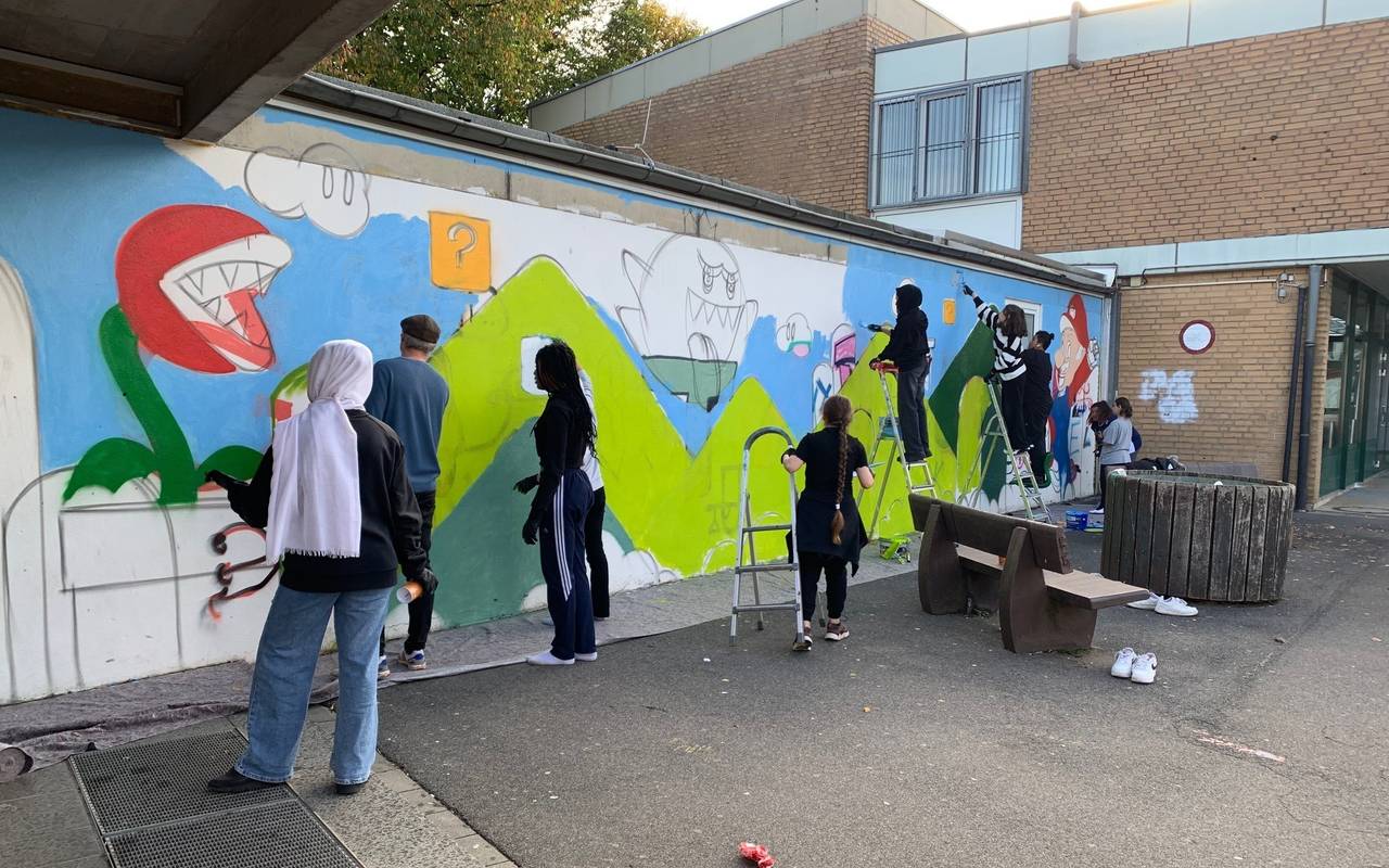 In Anlehnung an das Kunstprojekt „Stromkästen im Quartier“ ist die Wand der Turnhalle der Hauptschule neu gestaltet worden. Schülerinnen und Schüler der 9. Klasse haben bei einem dreitägigen Projekt mit dem Kölner Künstler Martin Scholz von #onkeldose zusammengearbeitet. Gemeinsam haben sie ein Graffiti zum Thema „Super Mario World“ entworfen und dann selber auf die Turnhalle gesprüht.
