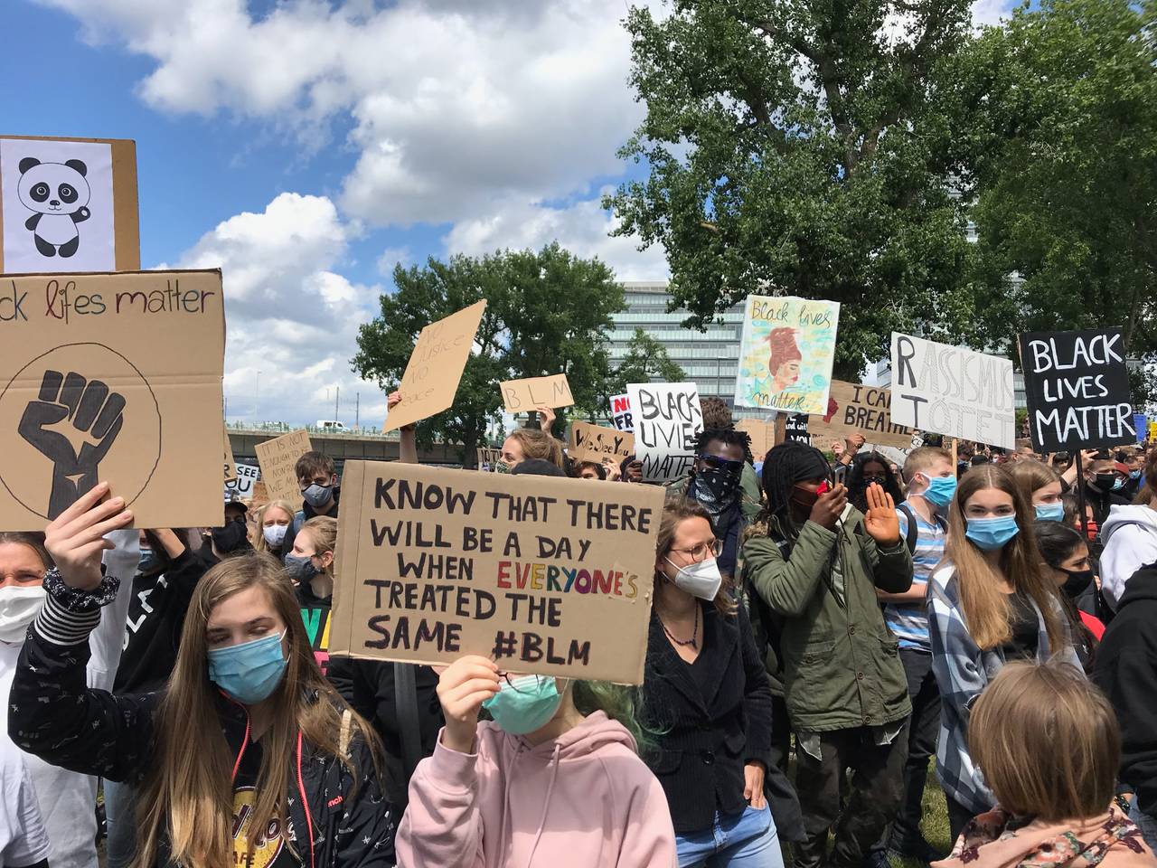 Die Menschen dort hielten Schilder hoch auf denen Stand „Meine Hautfarbe ist kein Verbrechen“ oder sie skandierten immer wieder „No Peace – No Justice“ und „Black Lives Matter“. Anlass der Demo war der gewaltsame Tod des Amerikaner George Floyd. Die Demonstranten wollten aber auch auf Rassismus hier bei uns aufmerksam machen. Ursprünglich hatten die Anmelder nur 500 Teilnehmer erwartet.