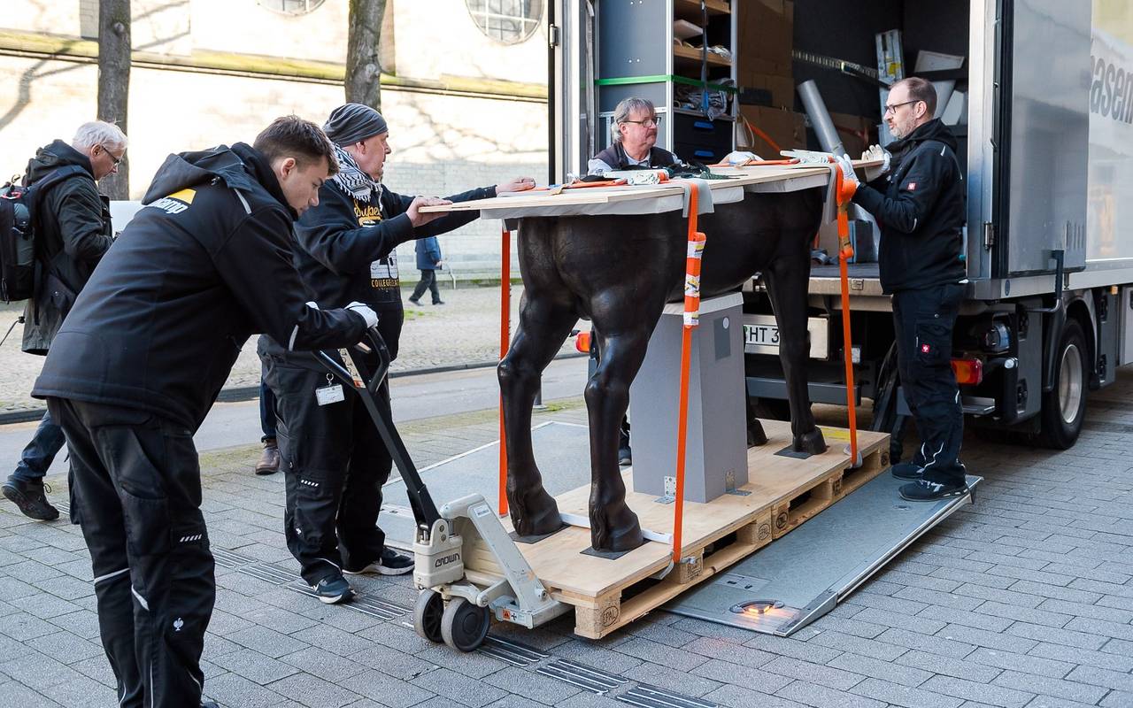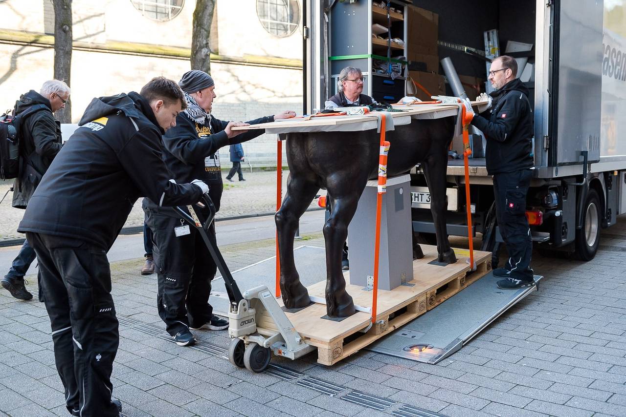 Am Kölnischen Stadtmuseum wurde es am Mittwochvormittag knifflig. Ein lebensgroßes historisches Holzpferd ist als letztes Großobjekt am neuen Standort des Museums in der Minoritenstraße angekommen.
