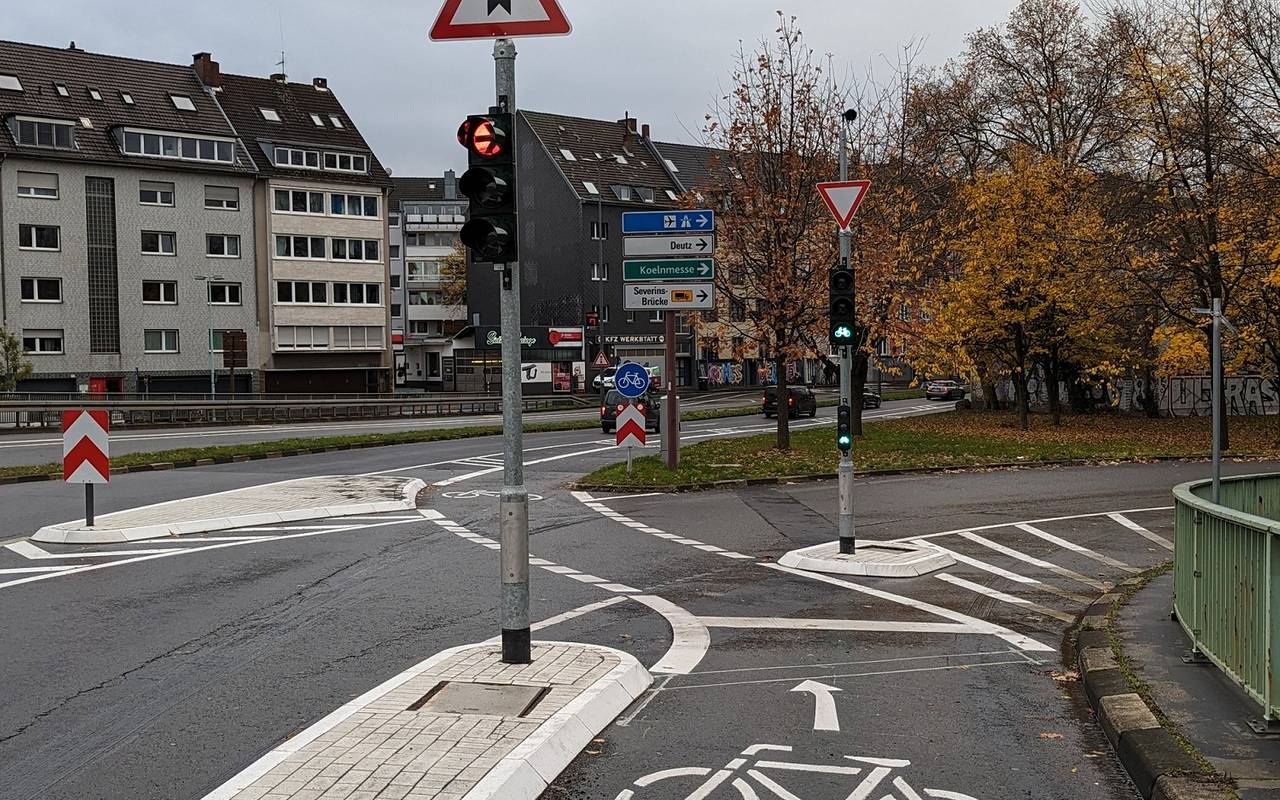 Eine Besonderheit gibt es auf der Zufahrt zur Severinsbrücke. Weil dort Autos und Radweg sich gefährlich kreuzen, wurde eine Ampel installiert, die den Radfahrern Vorfahrt gibt. Allerdings haben die Radfahrer an der Stelle nicht immer automatisch Priorität. Sollten besonders viele Autos auf einmal kommen, würden diese von der Ampel bevorzugt. Ziel der Stadt ist es, breite Radwege auf insgesamt 38 Kilometern zu bauen. 22 Kilometer gibt es bereits.